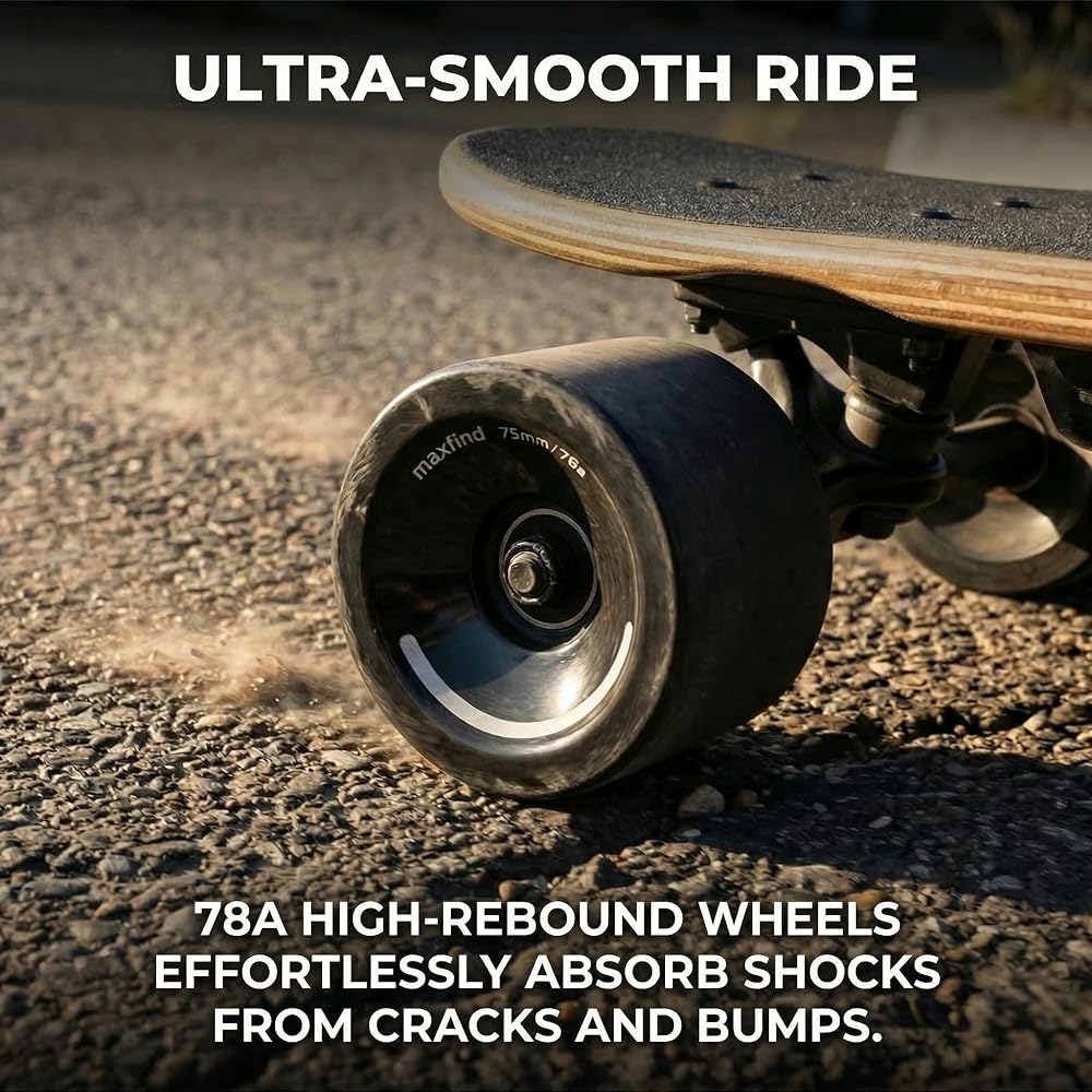 • تركيبة تخفيف الاهتزاز 78A: مصممة لتقليل إجهاد الساق أثناء التنقلات الطويلة. يعمل البولي يوريثين عالي الارتداد (78A) المتميز الخاص بنا كممتص للصدمات، مما يعمل على تنعيم ضوضاء الطريق والاهتزازات من أجل انزلاق سلس وصامت حتى على الأسطح الضعيفة.
