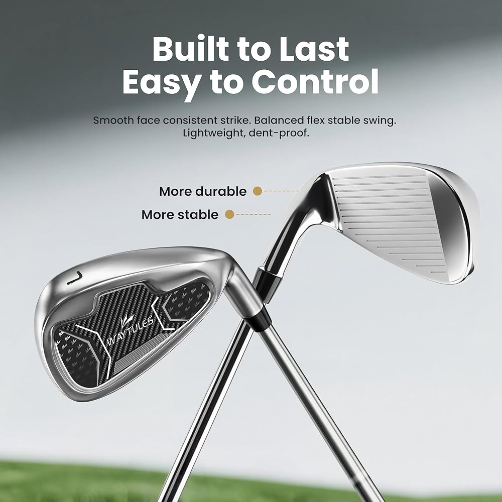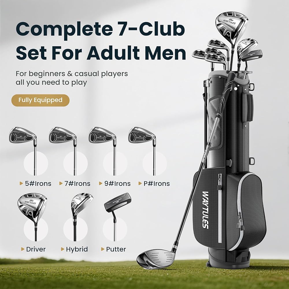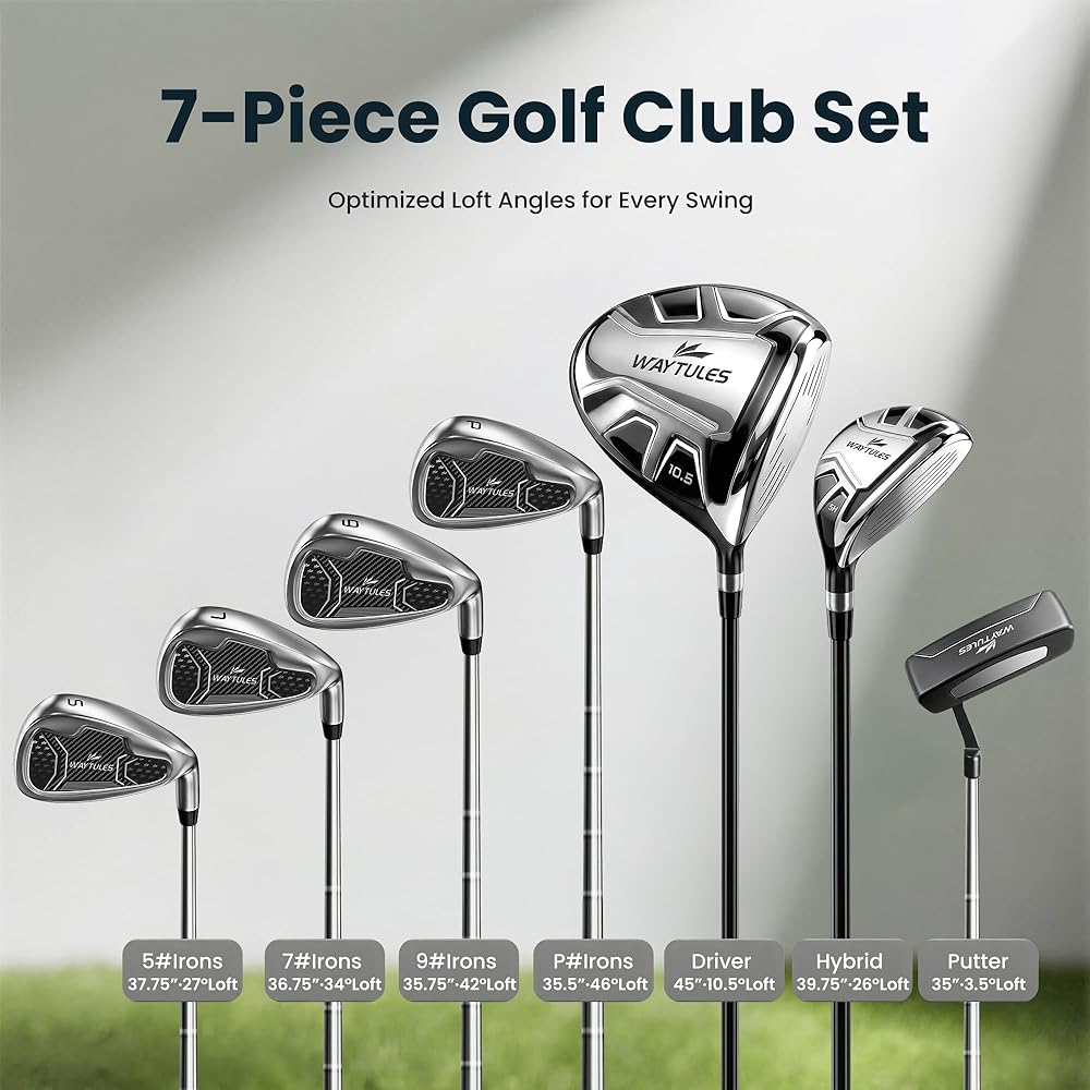 ⛳ مجموعة جولف كاملة مكونة من 7 أندية للمبتدئين، تتضمن هذه المجموعة سائق، 5# هجين، 5/7/9 مكاوي، إسفين رمي، ومضرب، مما يمنح لاعبي الجولف المبتدئين المزيد من خيارات النادي لمسافات ولقطات مختلفة.