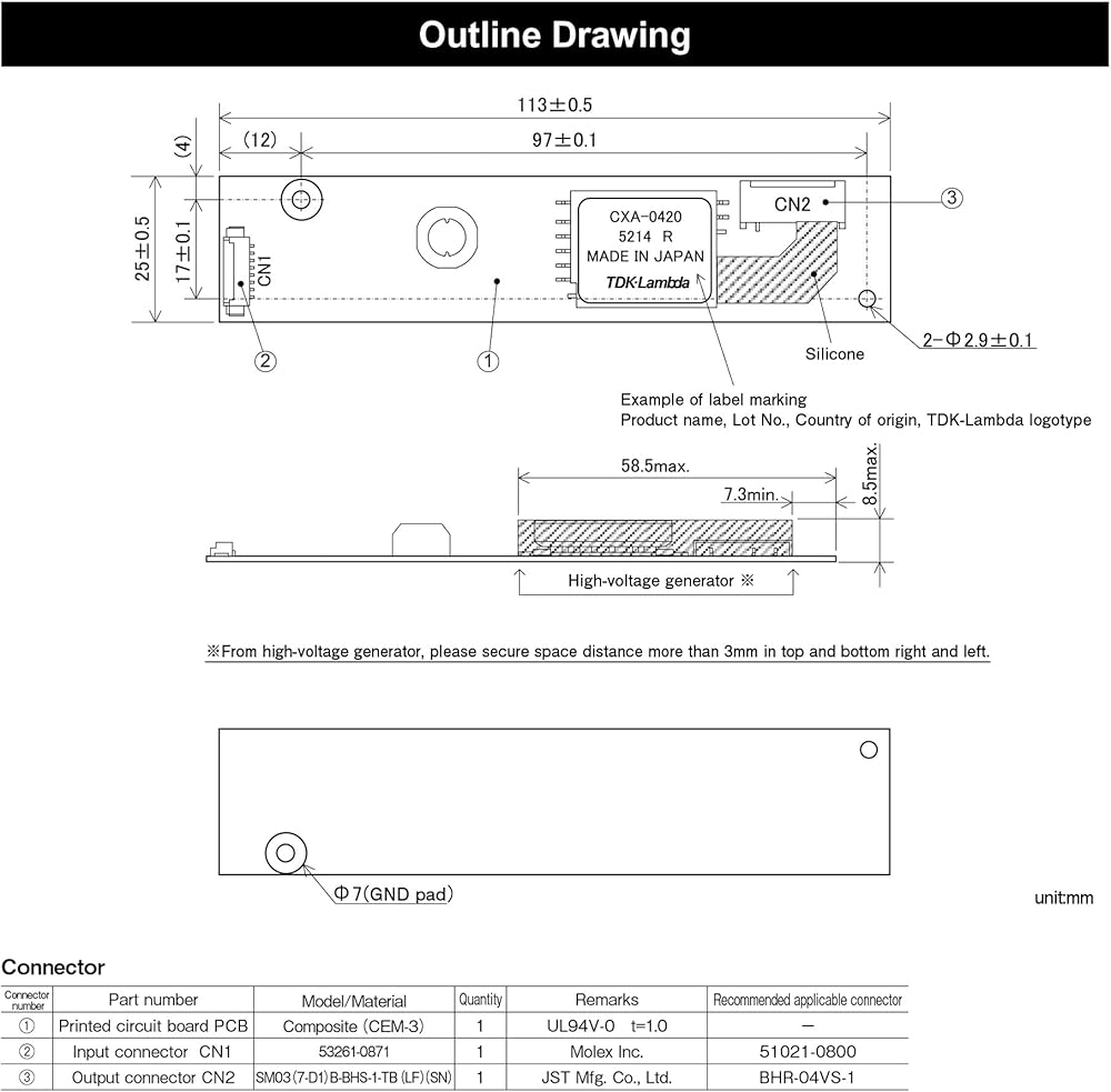 Its remote ON/OFF function allows easy integration with external circuits, while the silicone-coated high-voltage area ensures long-term durability and dust resistance. Measuring only 113 × 25 × 8.5 mm and weighing 20g, it offers high performance in a lightweight, space-saving design.