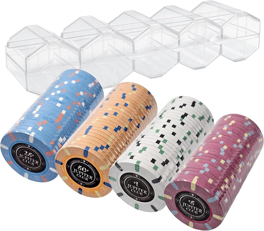 مادة طين الكازينو الحقيقية: مثل مجموعات رقائق البوكر المعمول بها في ميلانو وفينيكس، فإن رقائق بوكر Jupiter Club مصنوعة من طين الكازينو الأصلي بنسبة 100% للحصول على ملمس ترابي ووزن خفيف وصوت يتعرف عليه اللاعبون الجادون على الفور.
