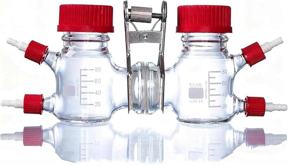 غرفة التفاعل الكهروكيميائي الميكروبي، مفاعل زجاجي عالي البورسليكات ثنائي الخلية من النوع H، غرفة التفاعل الكهروكيميائي، مع غشاء تبادل البروتون ومنفذ البرج، لتجارب سوائل المختبر