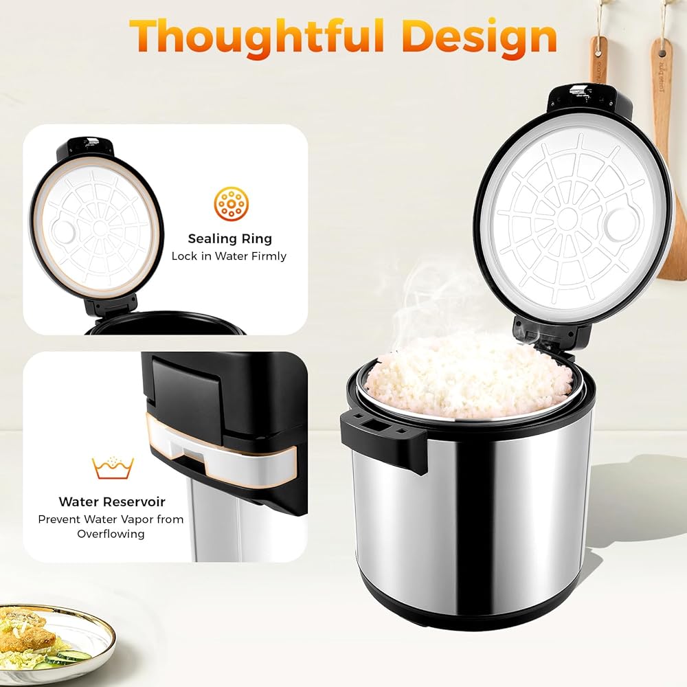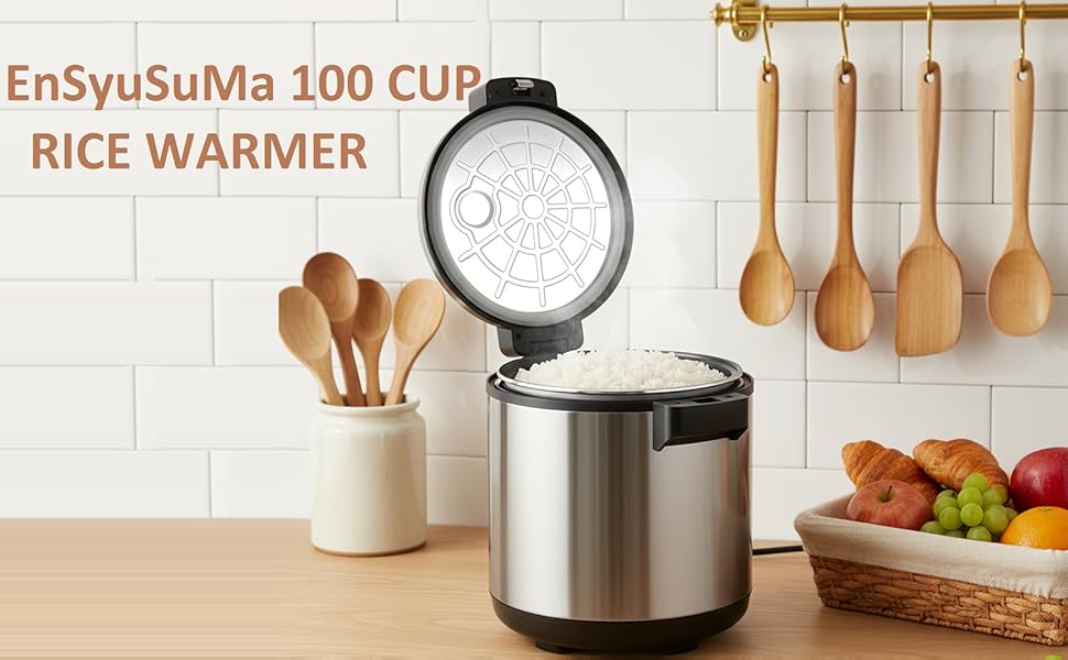جهاز تسخين الأرز التجاري، سخان طعام كهربائي عالي التحمل سعة 100 كوب مع ملعقة أرز وغطاء مفصلي، درجة حرارة قابلة للتعديل، مع وظيفة دافئة للمطاعم، وتقديم الطعام، والحفلات، وعاء داخلي غير لاصق