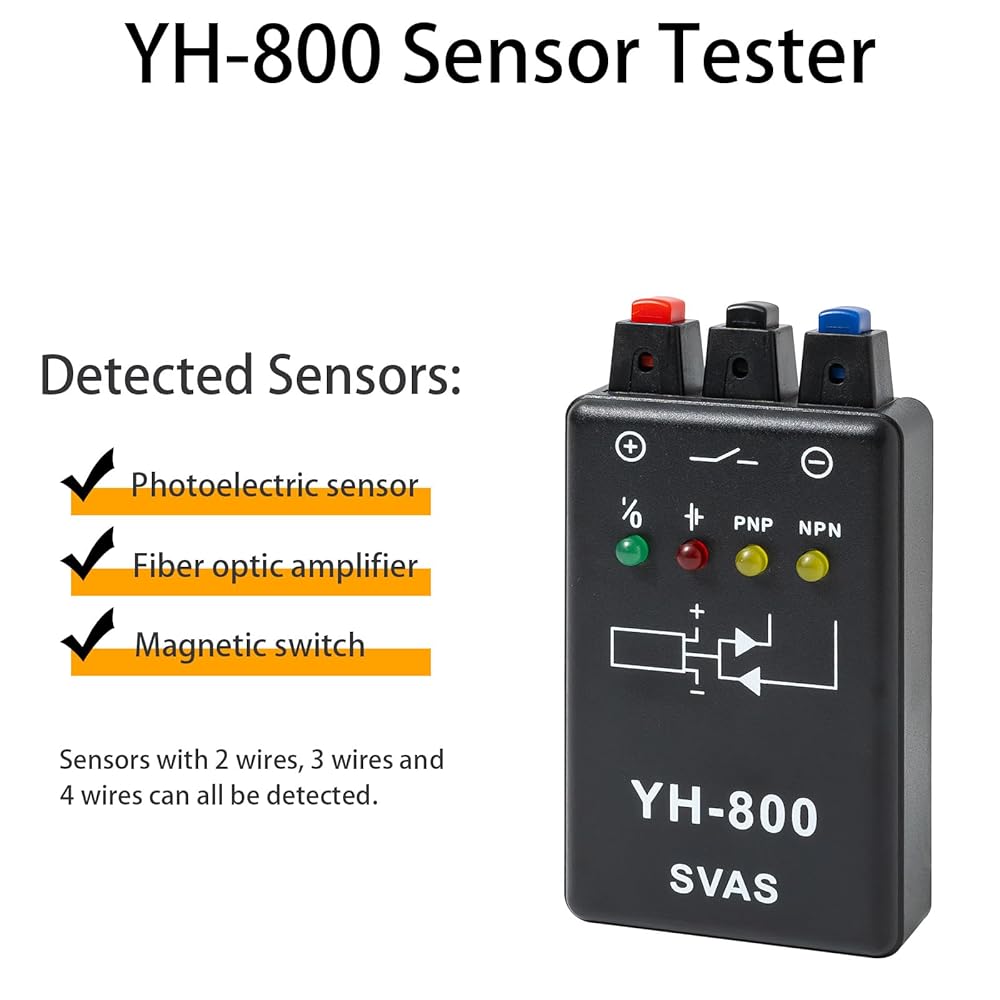 The YH-800 sensor tester is a versatile instrument that can detect photoelectric, proximity, magnetic switches and more. It has clear indications with different colored lights. Easy to operate with a fast response time. Comes with wiring diagrams for PNP and NPN types.