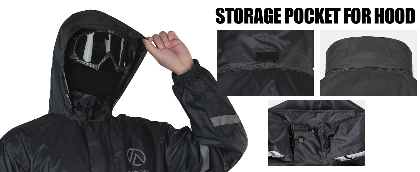 • ✅【يمكن إخفاء غطاء الرأس وتعديله】 يمكن إخفاء غطاء معطف المطر للدراجة النارية هذا من خلال تصميم التخزين في الجزء الخلفي من منطقة الرقبة دون إزالته. يمكن تعديل غطاء الرأس ليناسب المواقف المختلفة من خلال رباطين جانبيين.