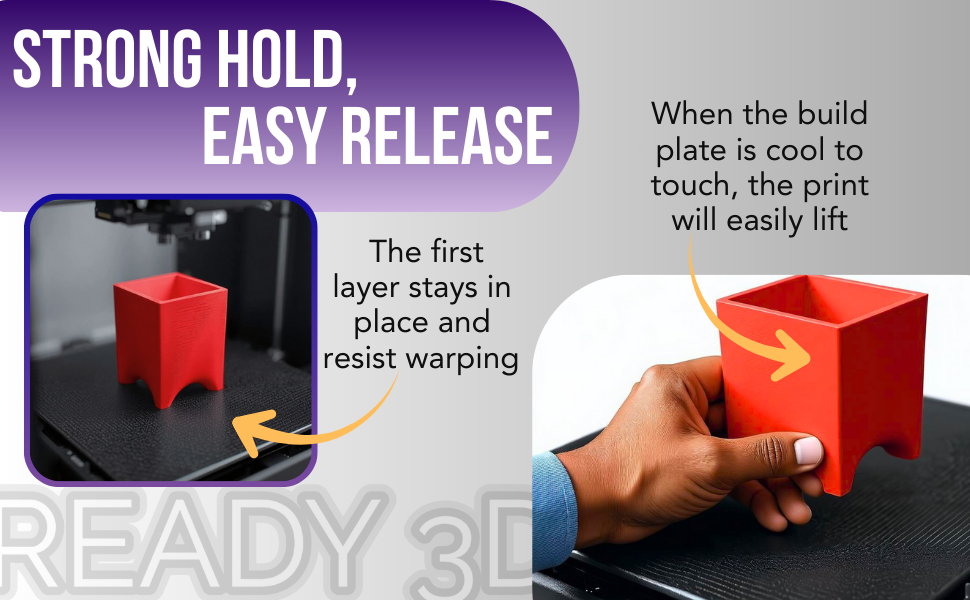 • -[ثبات ممتاز]- تبقى الطبقات الأولى في الأسفل. قد يؤدي التبريد السريع للطبقات العليا إلى اعوجاج الطباعة على لوحة التصميم، خاصة مع الخيوط مثل ABS وPETG. يتمتع لاصق لوحة البناء READY3D بالقدرة على حل المشكلة. زجاجة بحجم 3.38 أونصة متضمنة.