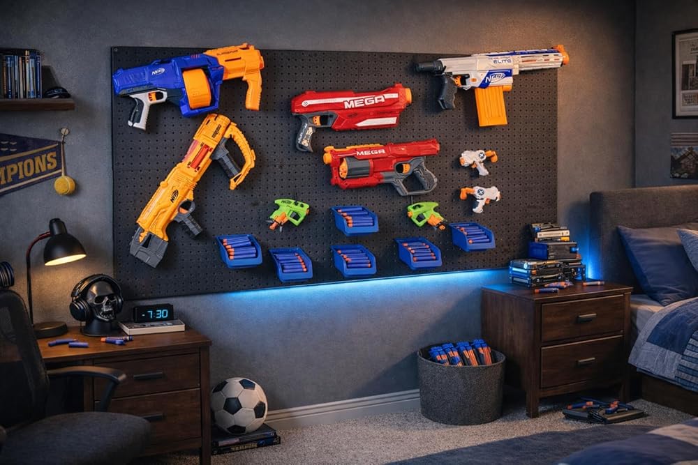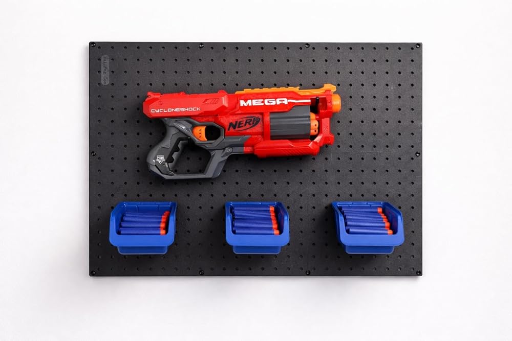 🛠 FULLY CUSTOMIZABLE LAYOUT Move the Flex-Lock peg hooks and peg board bins anytime to fit new blasters or gear. Your Nerf collection evolves — your wall system should too.