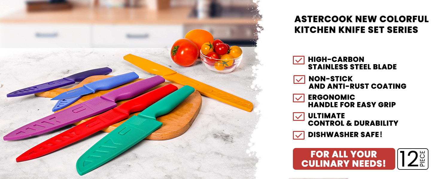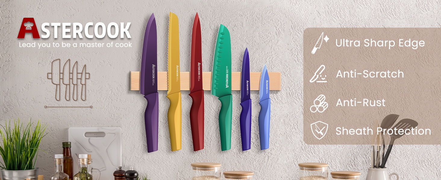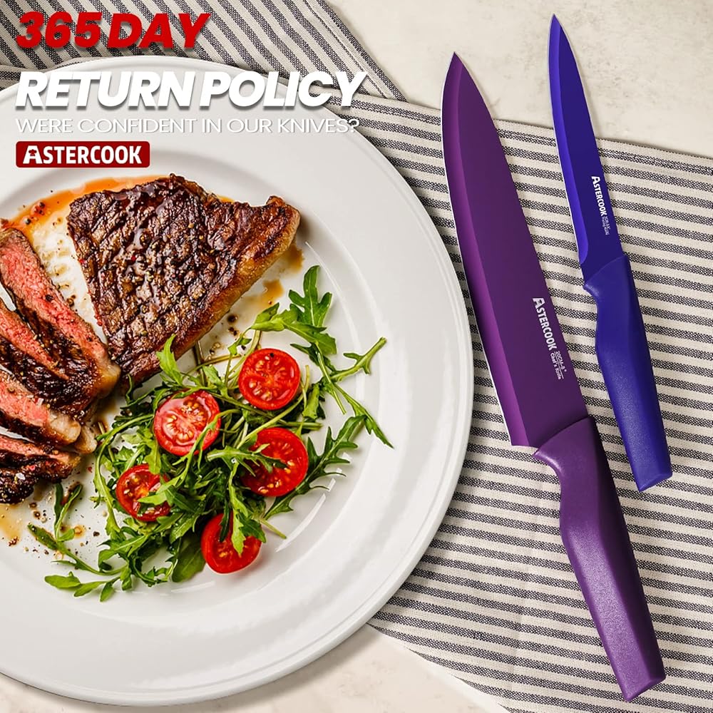مجموعة سكاكين أستركوك، مجموعة سكاكين مطبخ مرمزة بالألوان مكونة من 12 قطعة، طقم سكاكين شيف من الفولاذ المقاوم للصدأ مكون من 6 ألوان مضادة للصدأ مع 6 واقيات للشفرات، آمنة للاستخدام في غسالة الأطباق