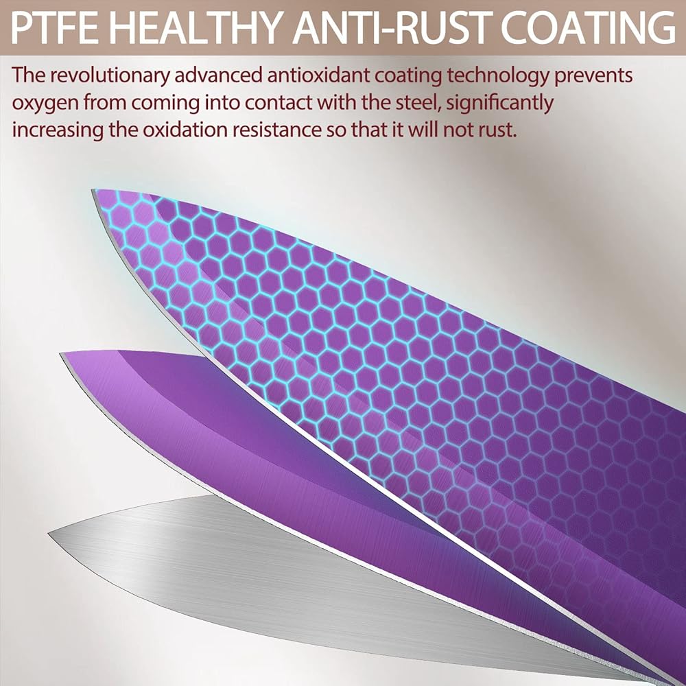 آمنة للاستخدام في غسالة الأطباق وطلاء مضاد للصدأ: لا يضيف الطلاء الملون لمسة نابضة بالحياة فحسب، بل يحمي أيضًا السكاكين من الصدأ عن طريق حمايتها من الاتصال المباشر بالأكسجين. مع الطلاء غير اللاصق، تبقى هذه السكاكين نظيفة ونقية طوال اليوم.