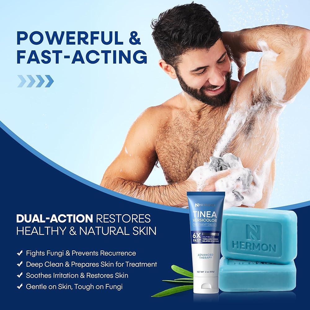 Tinea Versicolor Solution: This complete kit includes both a 2 oz cream and a 4 oz soap bar, providing a comprehensive approach for maximum effectiveness and skin health.