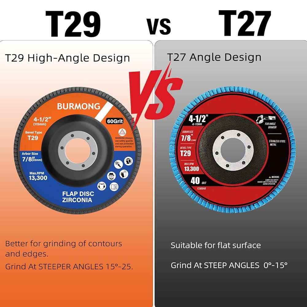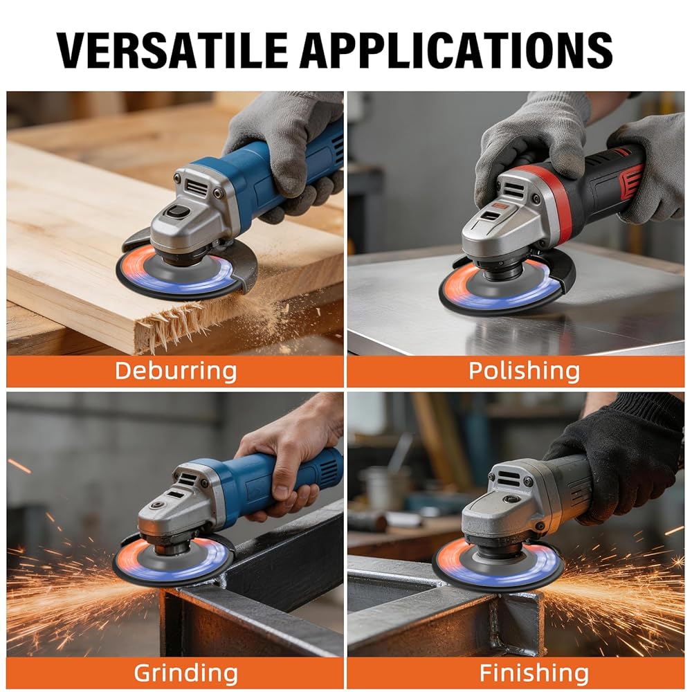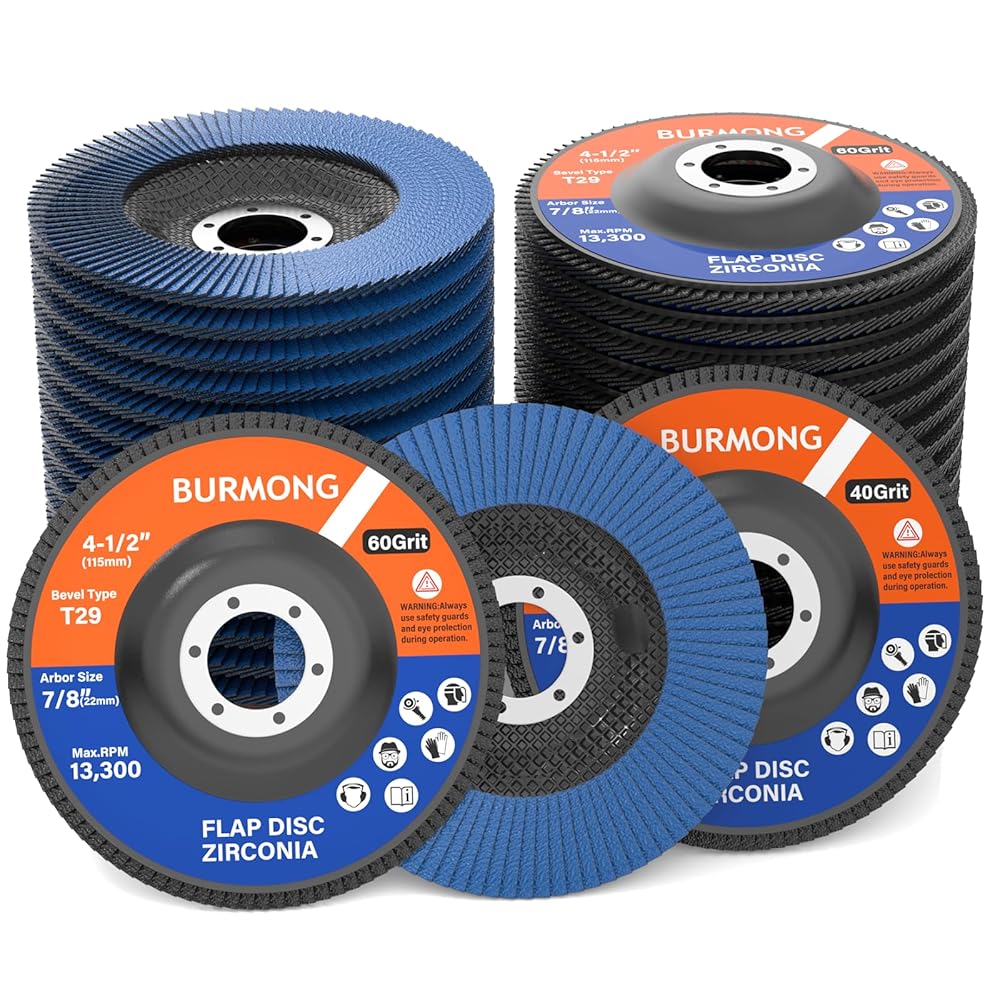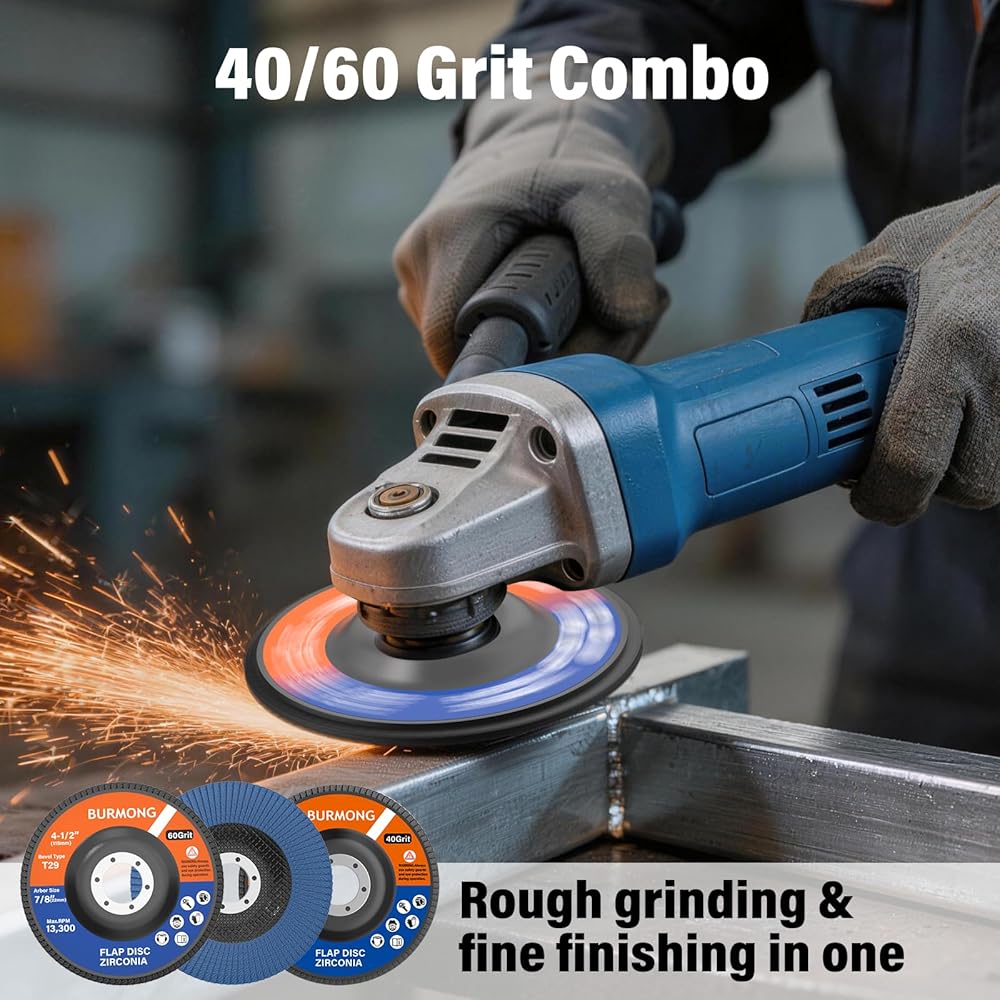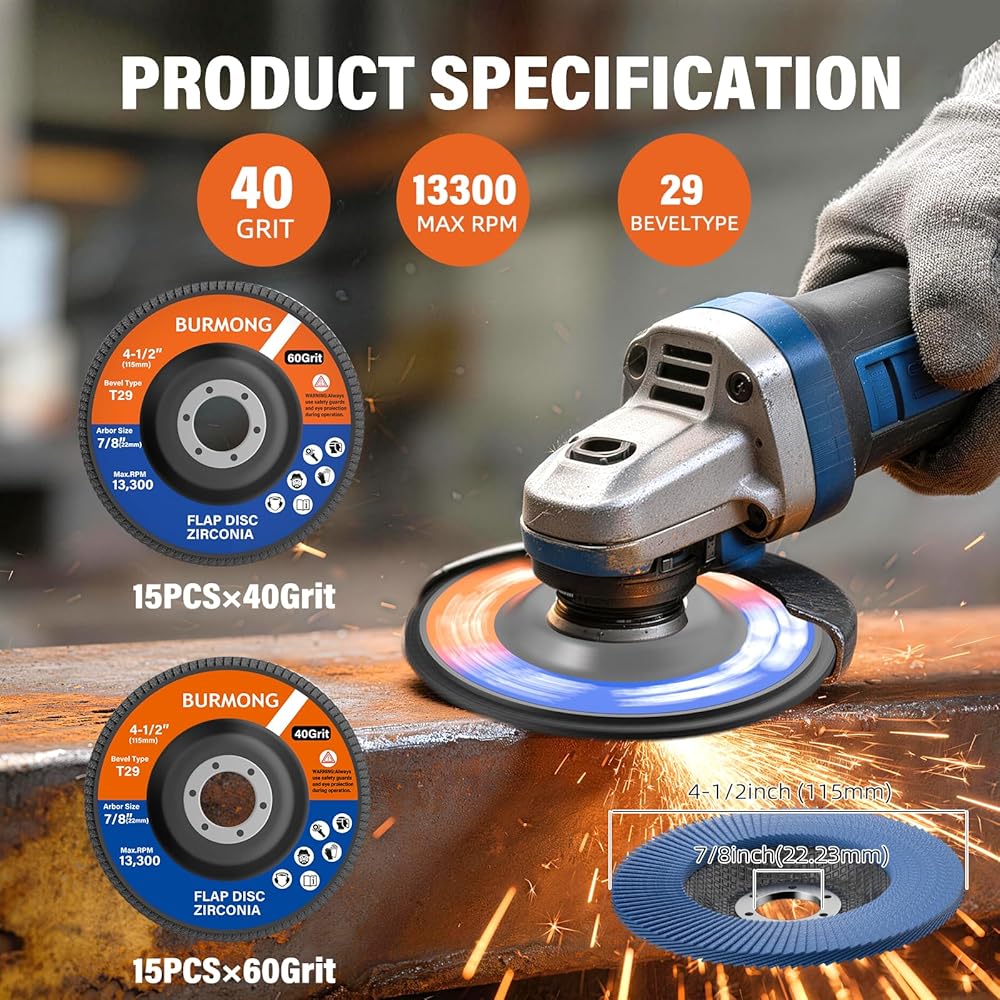 Wide Compatibility & Multi-Material Use--With a 4‑1/2" diameter and 7/8" arbor, BURMONG flap discs 4 1/2 for angle grinder are compatible with most standard angle grinders and support speeds up to 13,300 RPM. Suitable for metal, wood, plastic, fiberglass, and rubber, they are ideal for grinding, blending, sanding, and finishing across a wide range of materials and projects.