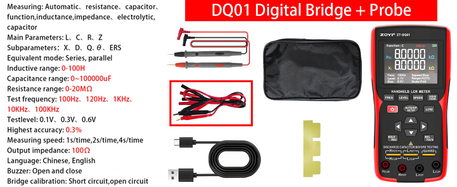 جهاز اختبار الجسر المحمول الرقمي عالي الدقة DQ01 قياس LCR، مقياس LCR عالي الدقة، والذي يمكنه تحديد الحث التلقائي/السعة/المقاومة. مجهزة بشاشة TFT مقاس 2.8 بوصة لعرض واضح ومدخل قياس بأربعة أسلاك، فهي تعمل على تحسين دقة القياس وموثوقيته بشكل فعال