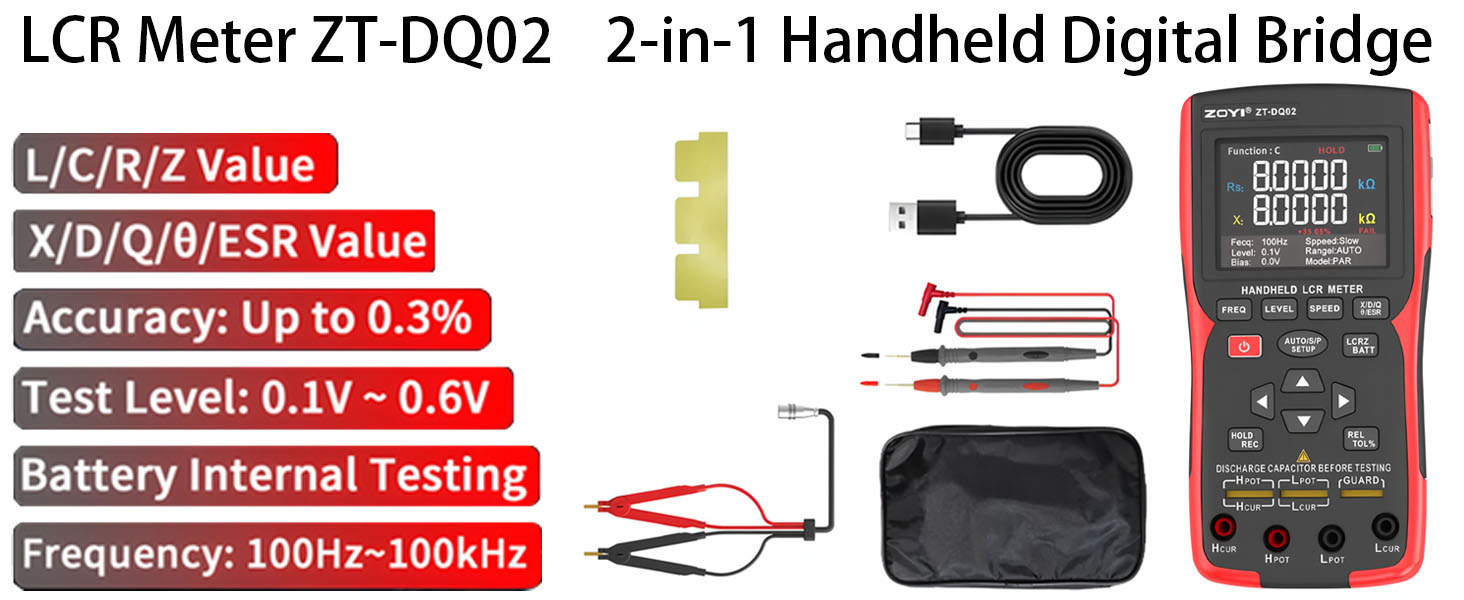 - DQ02 جهاز قياس LCR رقمي 2 في 1 عالي الدقة، الدقة: حتى 0.3%؛ مستوى الاختبار: 0.1 فولت ~ 0.6 فولت
