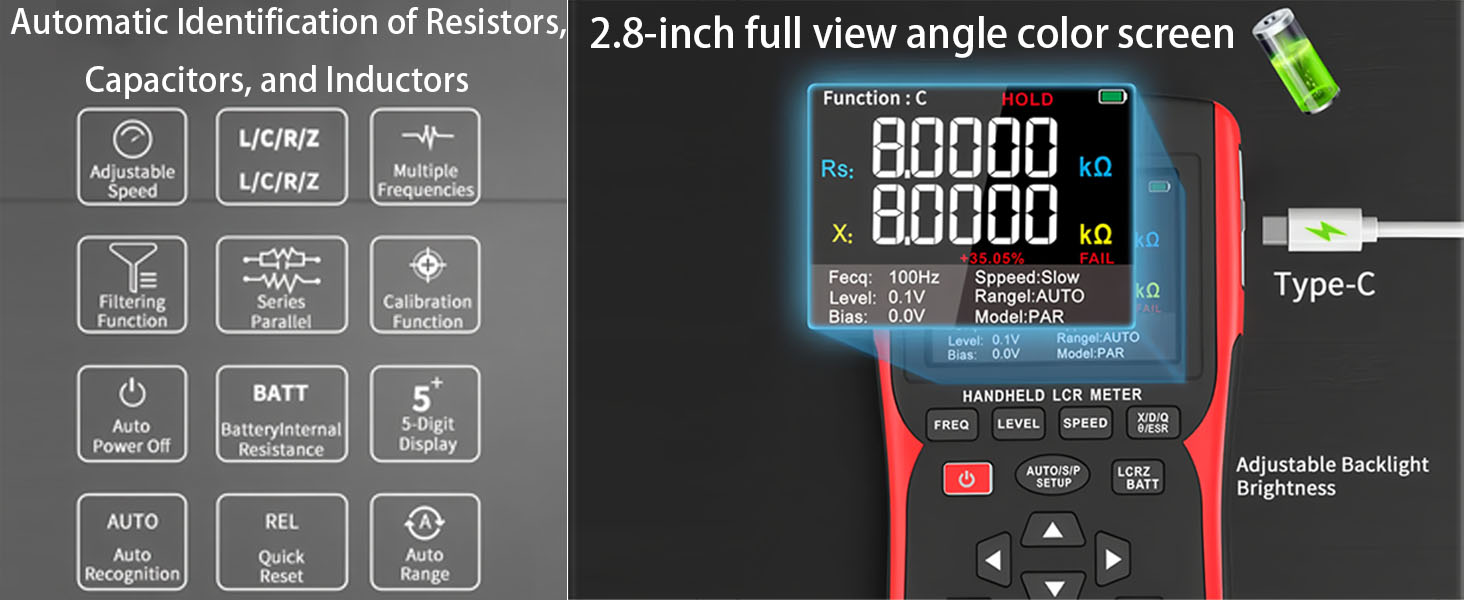 - 100 هرتز ~ 100 كيلو هرتز، السعة، الحث، المقاومة، اختبار المعاوقة، قيمة L/C/R/Z؛ قيمة X/D/Q/0/ESR