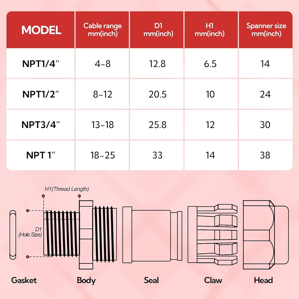 Size: 1"NPT, Cable range: 18-25mm (NPT Thread Size is a Nominal Pipe Size, and it Does Not represent the actual diameter)