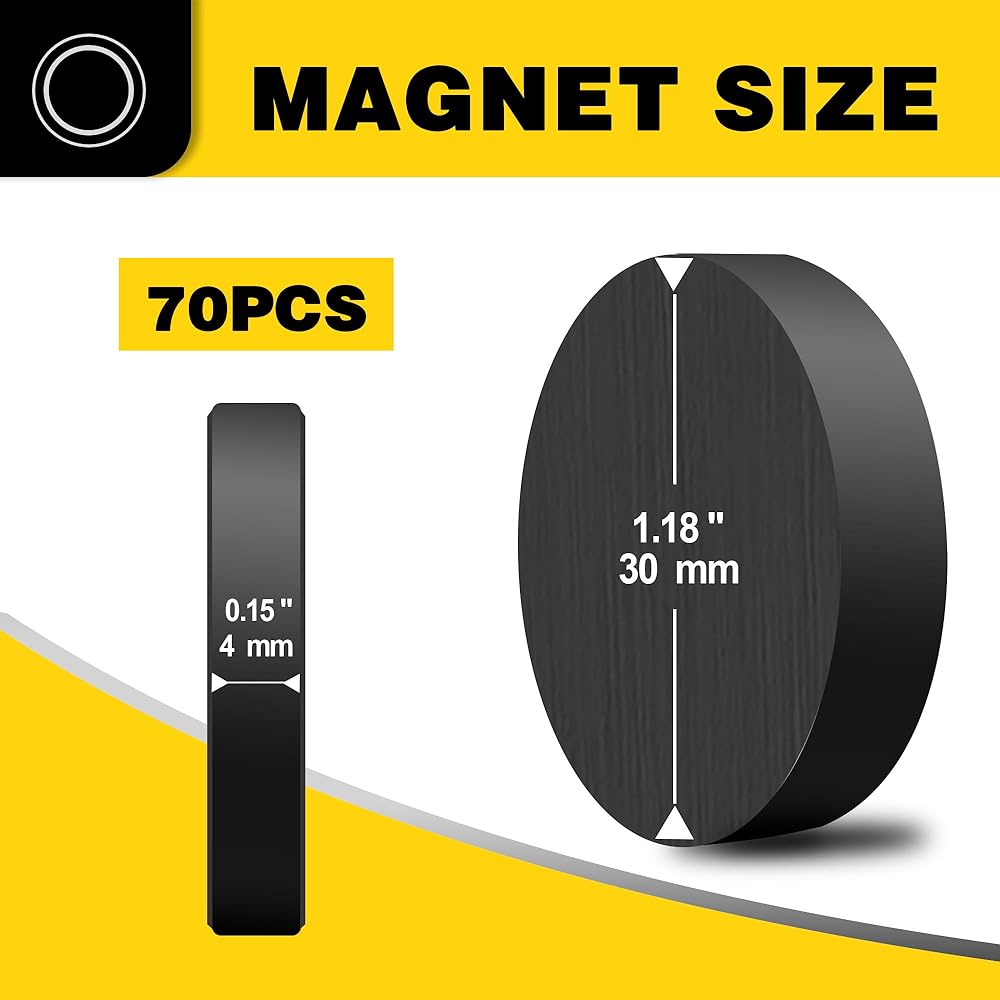 70PCS Round Ceramic Magnets: This pack includes 70pcs qualified round ceramic magnets, boasting an impressive magnetic strength for various applications. Each magnet measures 30mm (1.18") in diameter and 4mm (0.15") in thickness.