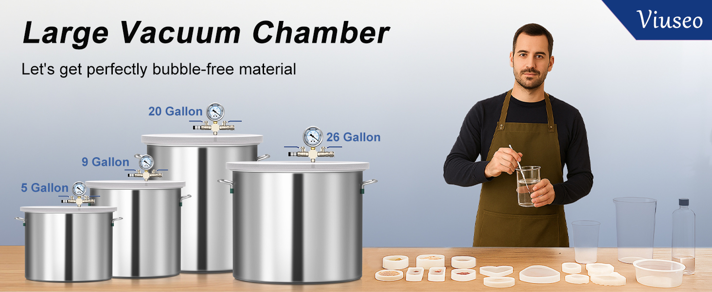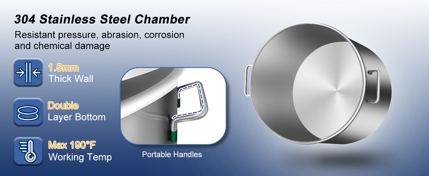 غرفة من الفولاذ المقاوم للصدأ 304: مصنوعة من الفولاذ المقاوم للصدأ القوي، تم تصميم حجرة التفريغ الخاصة بنا لضمان المتانة - مصممة لتحمل الضغط والتآكل والأضرار الكيميائية ودرجات الحرارة حتى 190 درجة فهرنهايت. بينما يضمن التصميم الداخلي الفسيح الظروف المثالية لإنشاء مصنوعات يدوية عالية الجودة وخالية من الفقاعات وإجراء تجارب دقيقة
