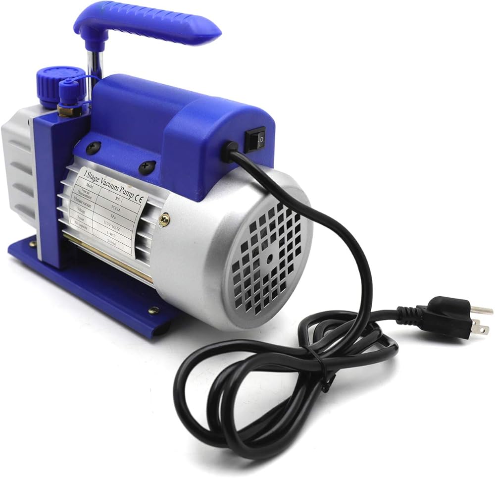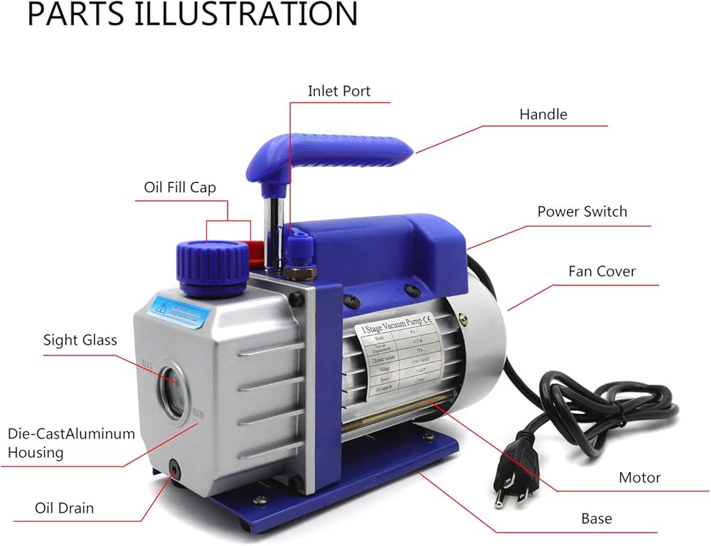 Vacuum Pump Voltage:110V 60HZ Power: 1/4 HP Single Stage 3.6CFM, Pump Ultimate Vacuum : 0.8 Pa; Intake fitting: 1/4 inch Flare Oil Capacity : 200 ml