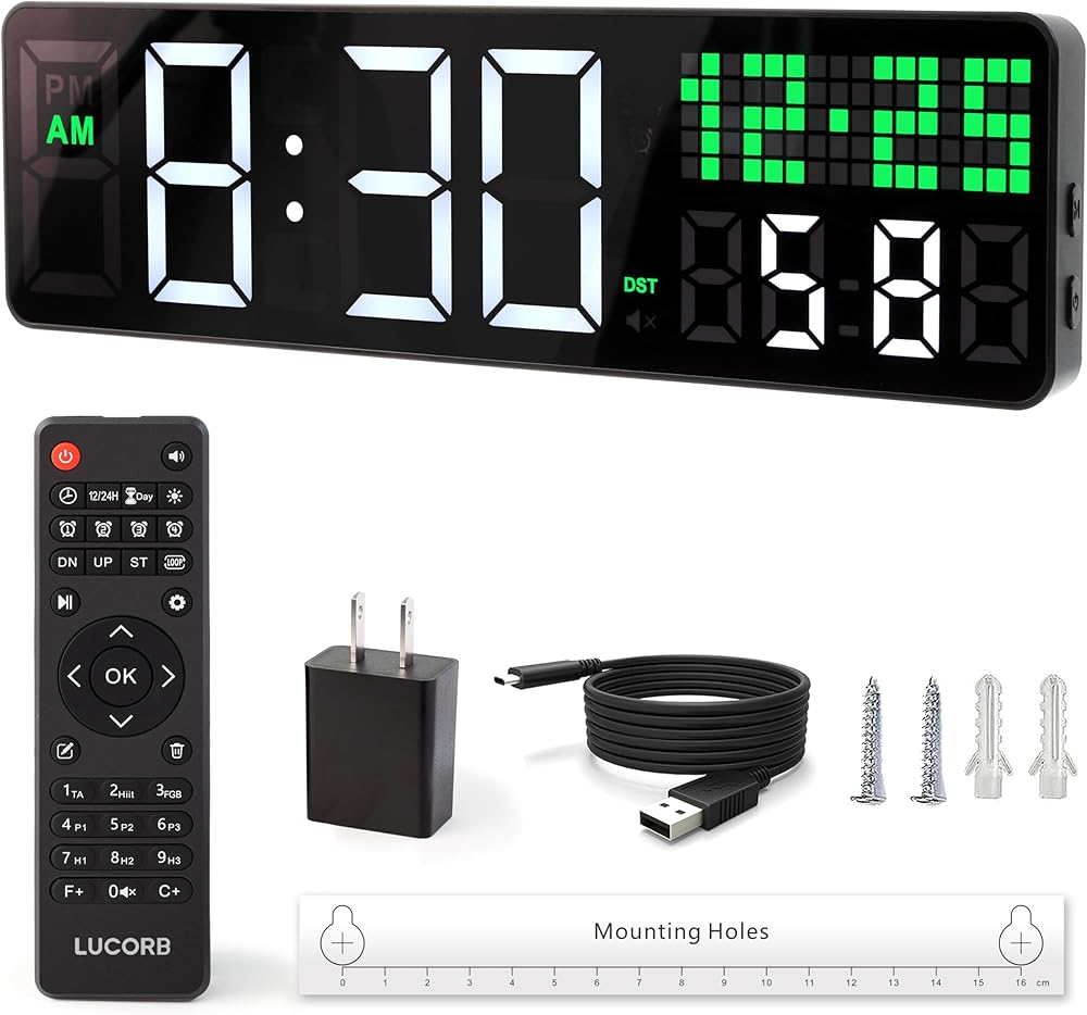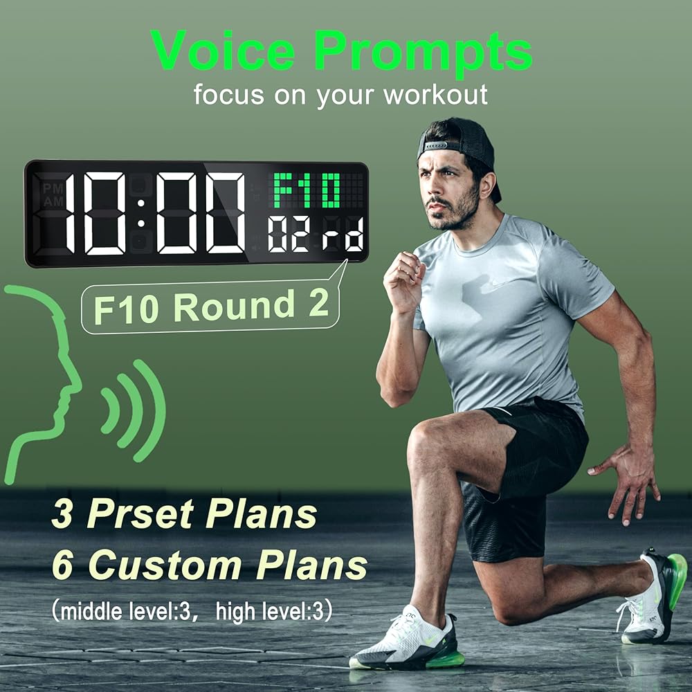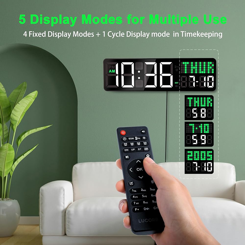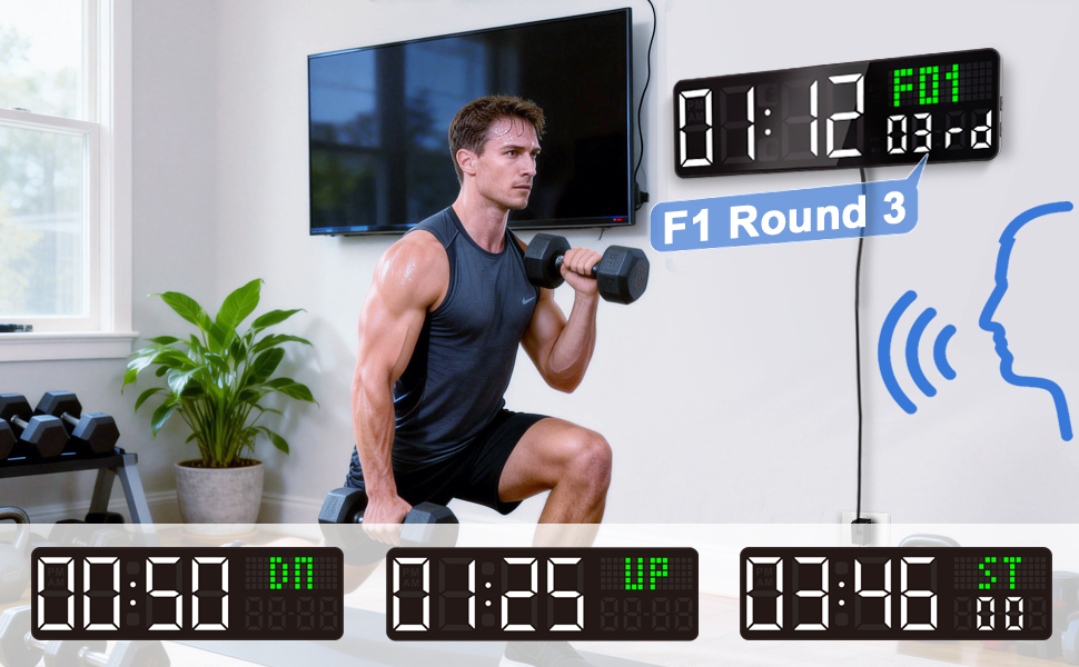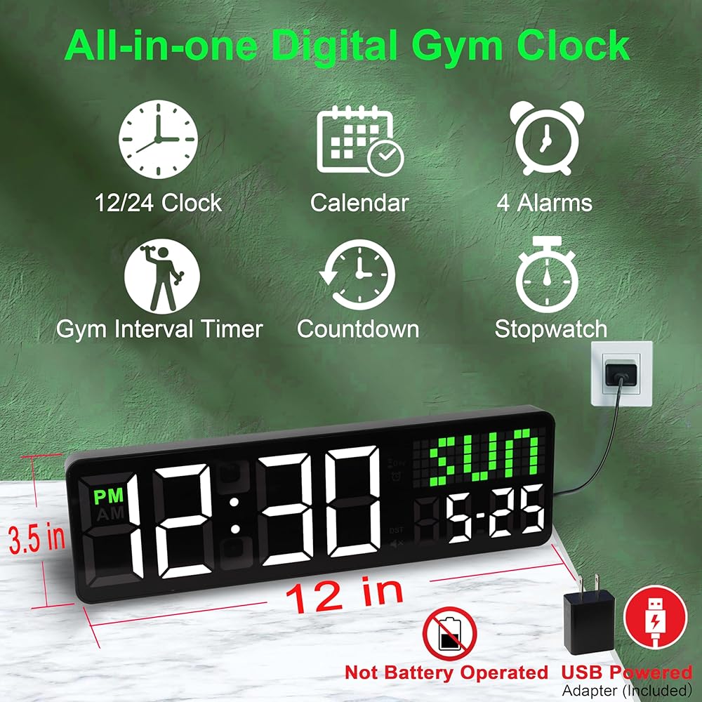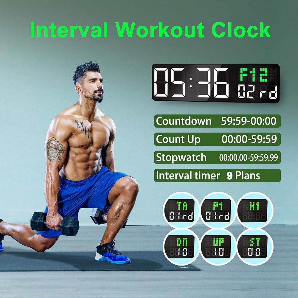 【ساعة حائط رقمية لصالة الألعاب الرياضية مع ثوانٍ/تاريخ】 تتميز بـ 5 أوضاع عرض متعددة الاستخدامات للوقت والتاريخ/يوم الأسبوع، ومؤقت العد التنازلي، وساعة التوقف، ومناسبة لإعدادات متعددة بما في ذلك تدريبات الصالة الرياضية، واجتماعات المكتب، والفصول الدراسية، وديكور المنزل.