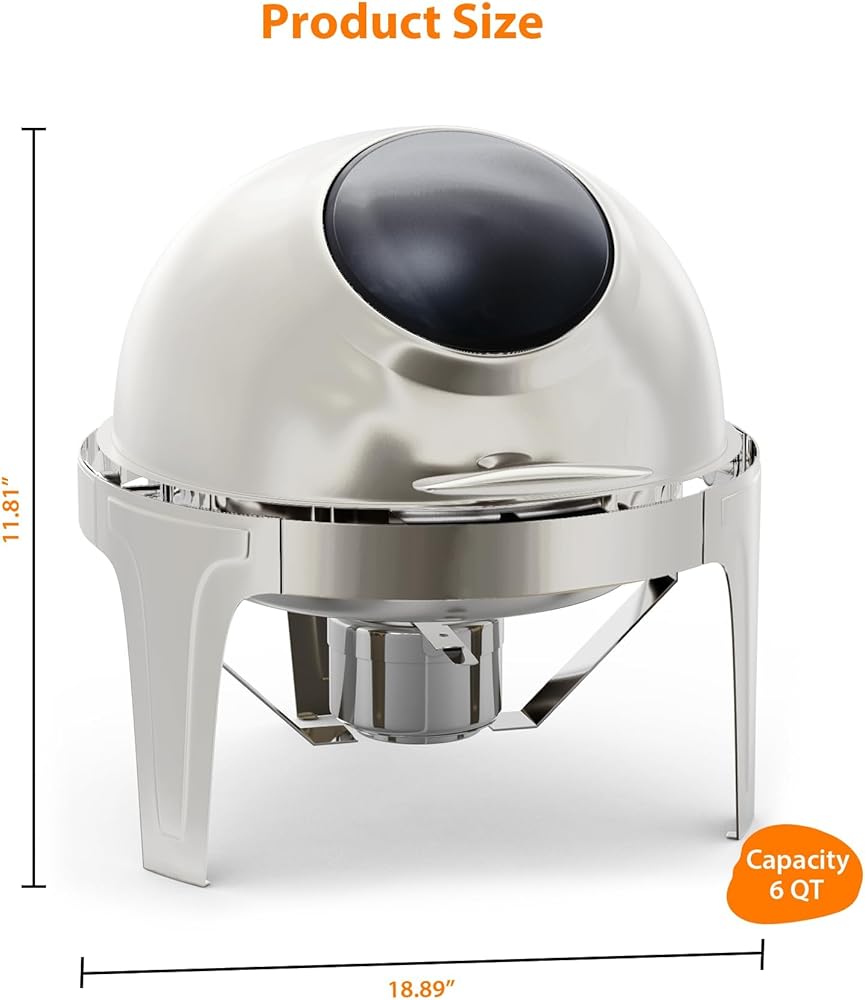 6.3 Quart Stainless Steel Roll Top Chafing Dish Buffet Set with Glass WindowEnhance your catering experience with our high-quality 6.3 QT Round Stainless Steel Roll Top Chafing Dish Buffet Set, expertly designed for professional food service settings including banquets, weddings, graduation events, and parties. This chafing dish combines style, functionality, and durability, making it an necessary tool for restaurants, hotels, and event planners.