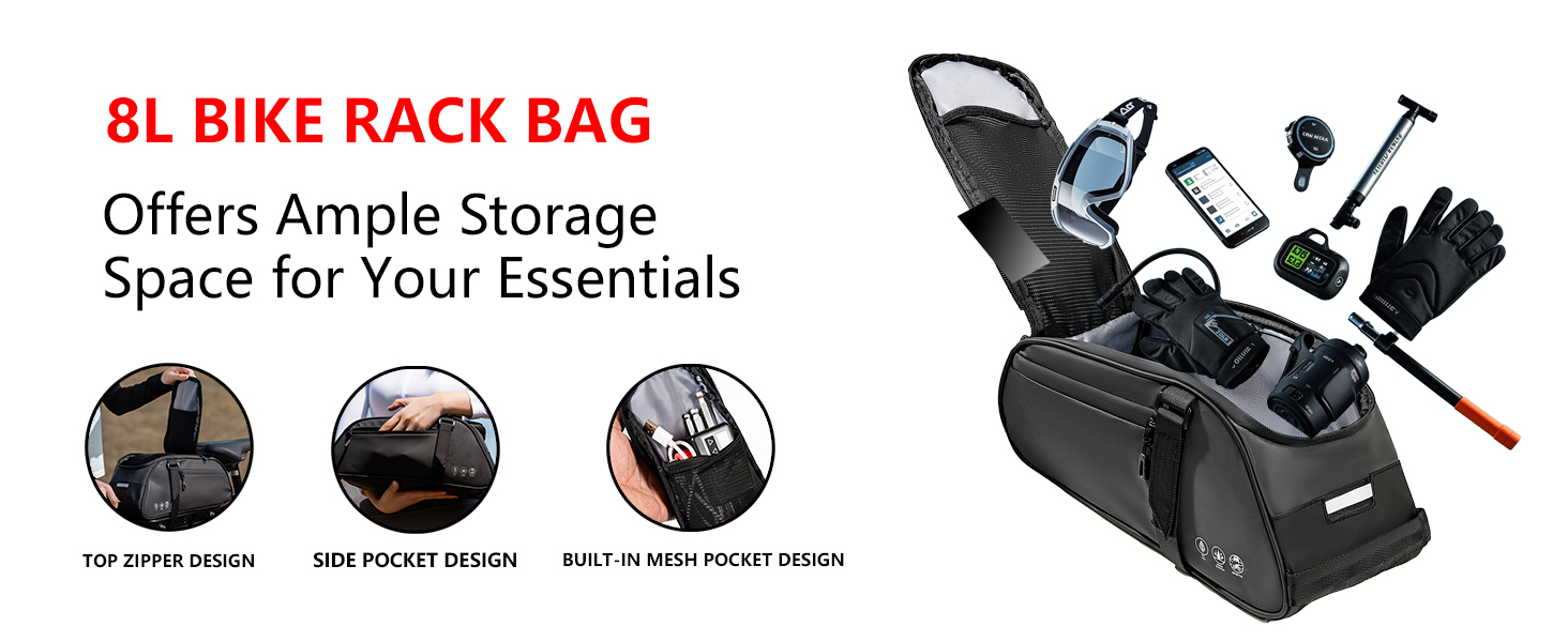 سعة كبيرة 8 لتر وتنظيم ذكي: بأبعاد 15 × 6.3 × 6.3 بوصة (طول × عرض × ارتفاع)، توفر هذه الحقيبة مساحة تخزين واسعة لضرورياتك، بما في ذلك المحافظ والهواتف والملابس وأدوات الدراجة وزجاجات المياه والمزيد. تتميز بجيب رئيسي وجيبين جانبيين وجيب علوي بسحاب وجيبين داخليين شبكيين للحفاظ على أغراضك منظمة بشكل أنيق.
