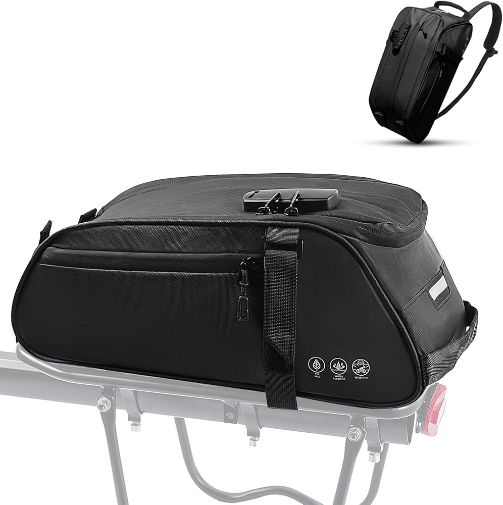 تعزيز الرؤية الليلية والسلامة: حافظ على سلامتك أثناء الرحلات الليلية مع منطقة القماش العاكسة الكبيرة لحقيبة حامل الدراجة الخاصة بنا وحلقة خلفية للضوء الخلفي (الضوء الخلفي غير متضمن). يضمن التصميم العاكس أنك مرئي للآخرين، مما يجعل ركوب الدراجات الليلية أكثر أمانًا وأمانًا.