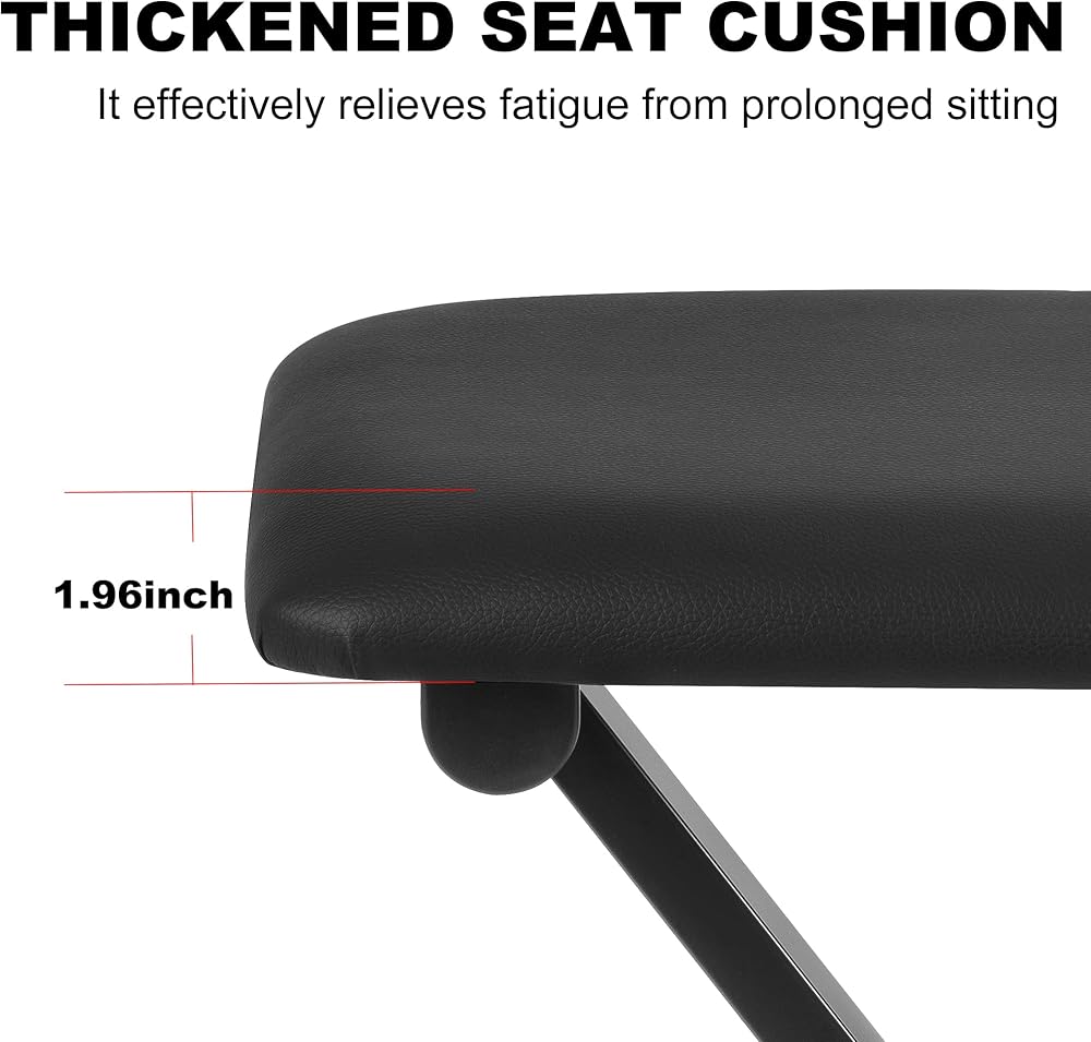 سميك لمزيد من الراحة، مما يساعدك على التركيز على التدريب. مجهزة بوسادة مقعد قطنية عالية الكثافة مقاومة للهب (15.75 بوصة طول × 11.81 بوصة عرض × 1.96 بوصة سمك)، فهي توفر دعمًا ثابتًا ووسادة ناعمة، مما يقلل بشكل فعال من التعب الناتج عن جلسات التدريب الطويلة ويساعدك على التركيز على الموسيقى.