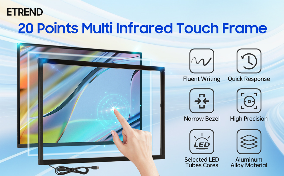 【مواد عالية الجودة】إطار اللمس بالأشعة تحت الحمراء متعدد اللمس 20 هذا مصنوع من إطار من سبائك الألومنيوم عالي الجودة، والذي لا يضمن فقط متانة الجهاز واستقراره على مدار فترة طويلة من الوقت، ولكنه يحقق أيضًا استجابة سريعة ونعومة فائقة لعملية اللمس. ويوفر هيكله عالي الجودة المصمم جيدًا للمستخدمين تجربة لمس متينة لا يمكن تصورها، مما يجعل العمل أكثر كفاءة والترفيه أكثر متعة.