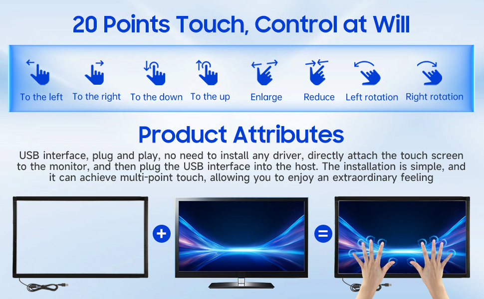 【واجهة USB، معايرة تلقائية ذكية】 من خلال واجهة USB، يمكن توصيل طبقة اللمس بالأشعة تحت الحمراء هذه بسهولة بجهاز كمبيوتر لنقل البيانات بسرعة. وفي الوقت نفسه، تتمتع لوحة شاشة اللمس Ir أيضًا بوظيفة المعايرة التلقائية الذكية التي تضمن دقة اللمس دون الحاجة إلى قيام المستخدمين بضبط المعلمات يدويًا. يعتمد إطار اللمس بالأشعة تحت الحمراء هذا أيضًا على تصميم خالٍ من السائق. يمكن للمستخدمين استخدامه مباشرة دون تثبيت برامج تشغيل إضافية.