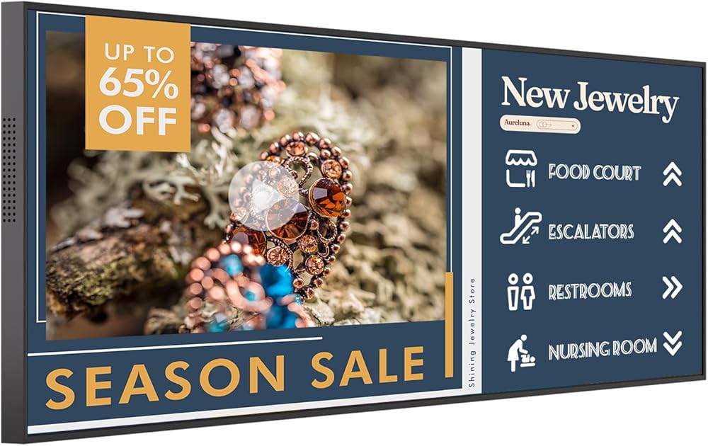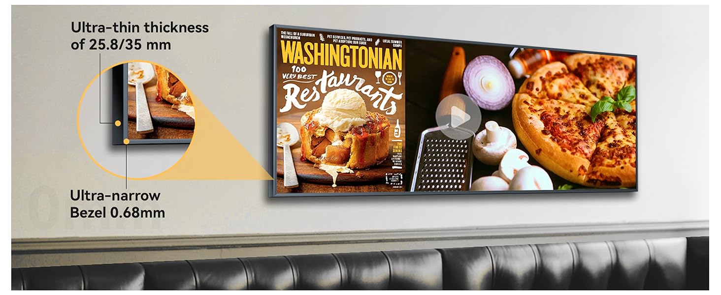 شاشة شريطية فائقة الدقة بالكامل - تصميم موفر للمساحة: يمكنك تحقيق أقصى قدر من التأثير البصري في الحد الأدنى من المساحة من خلال ملف تعريف نحيف مقاس 1.02 بوصة ونسبة عرض إلى ارتفاع فائقة العرض تبلغ 16:9. مثالية لشاشات الرف أو العدادات أو لافتات البيع بالتجزئة حيث لا تناسب الشاشات التقليدية. تضمن الدقة الواضحة أن المحتوى الخاص بك يبدو حادًا دائمًا.