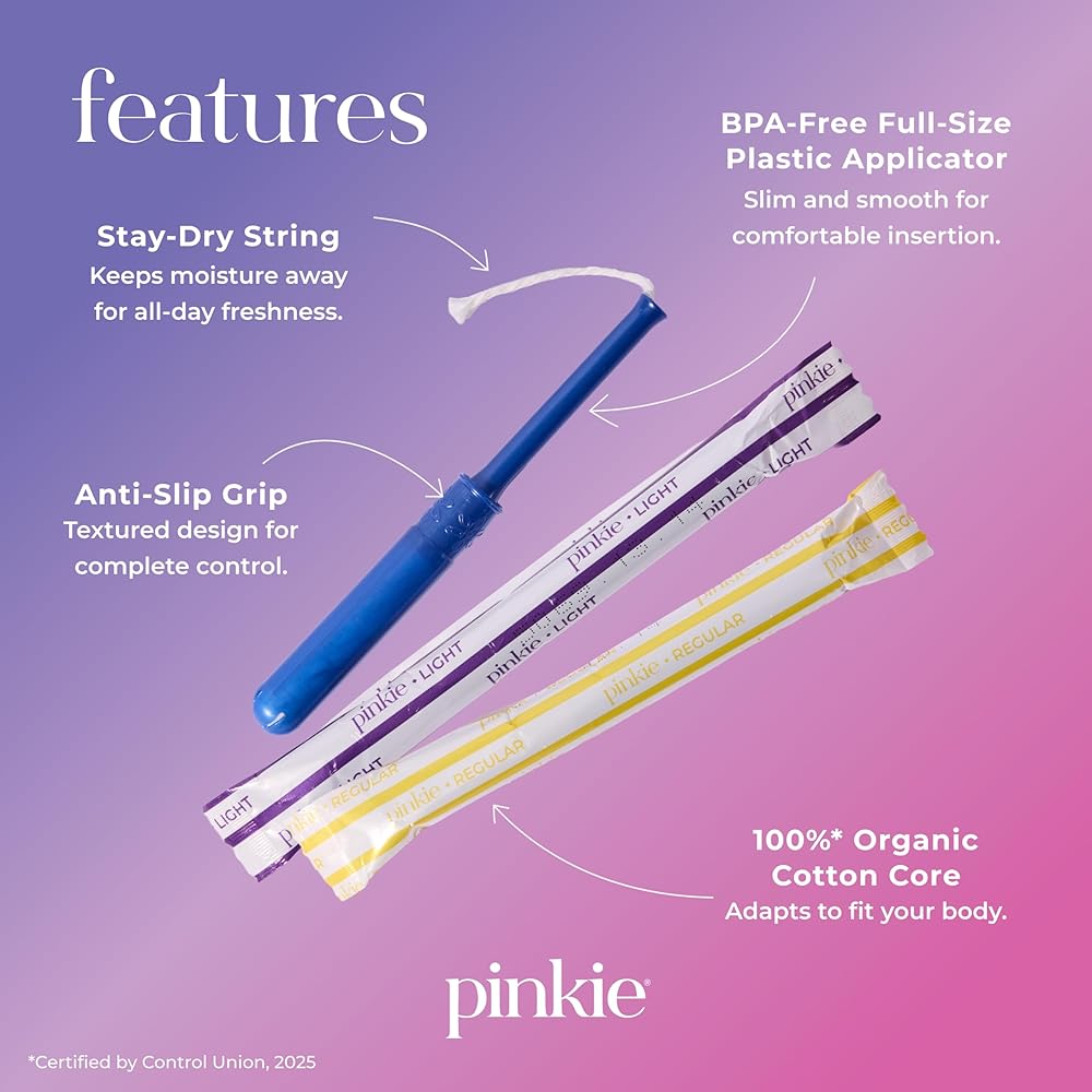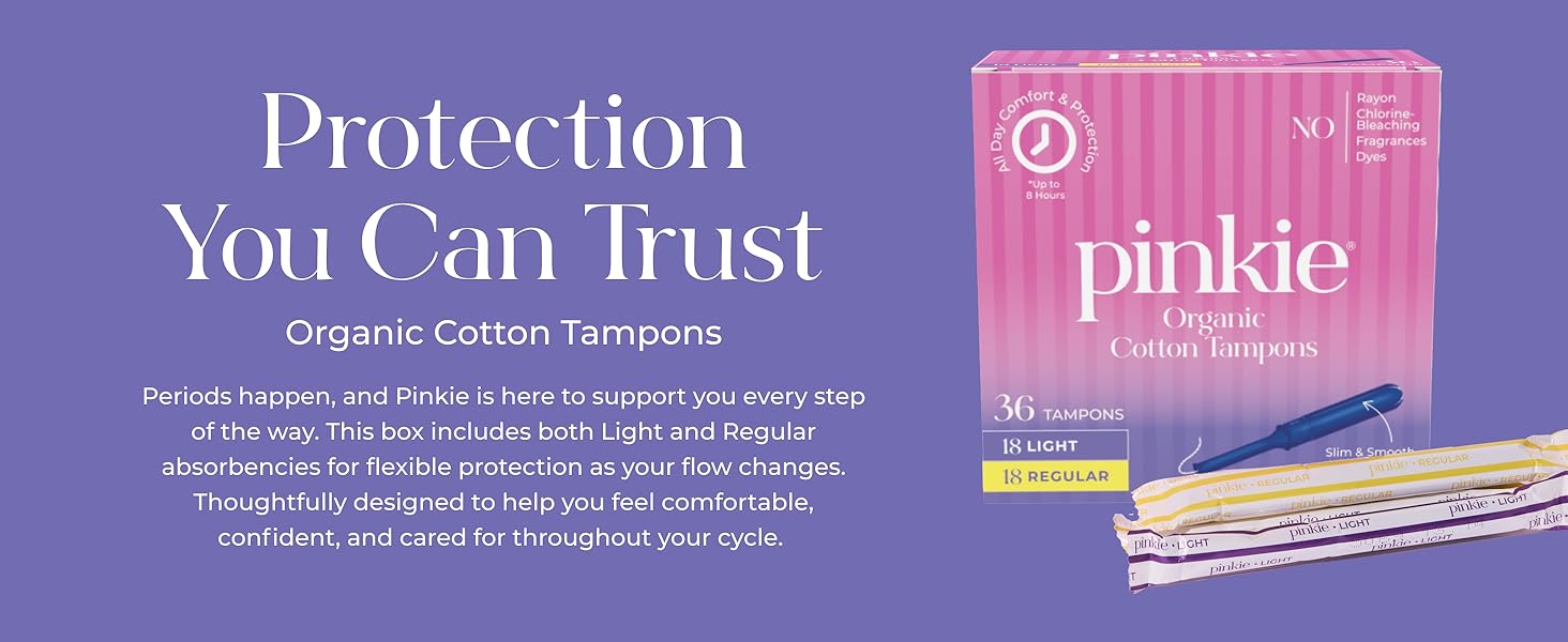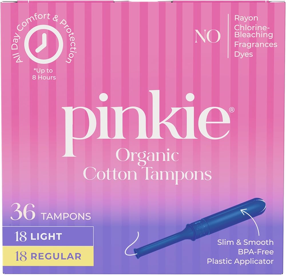 سدادات قطنية عضوية من بينكي للمراهقين والبالغين - مصنوعة من القطن بنسبة 100% تتكيف مع جسمك - أداة توزيع رفيعة خالية من مادة BPA لإدخال مريح - خالية من الكلور والعطور والصبغات والرايون - خفيفة/عادية، 36 قطعة