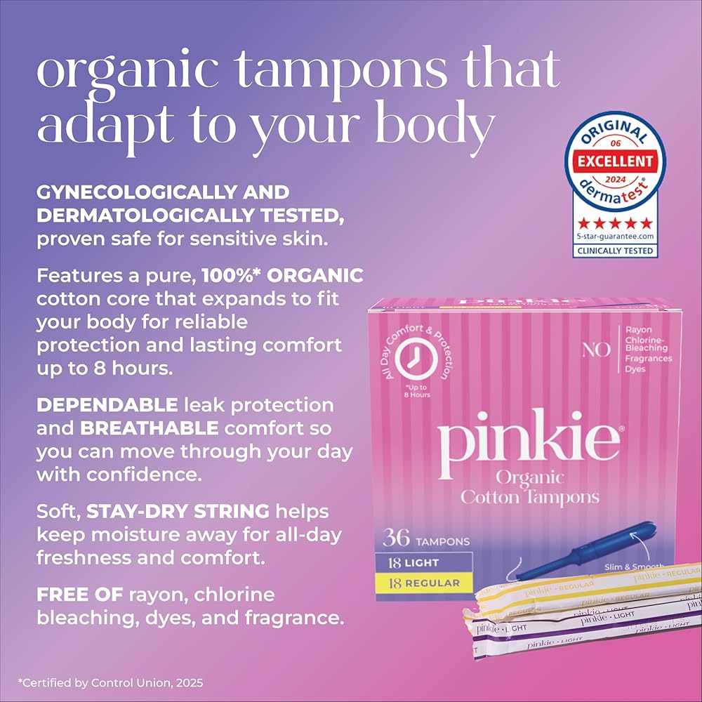 عضوية وتم اختبارها على نطاق واسع: تم اختبارها من قبل أطباء النساء والجلد، فوط بينكي العضوية خالية من السموم وآمنة للبشرة الحساسة. لا يوجد حرير صناعي أو كلور أو صبغات أو عطور هنا - فقط قطن عضوي ناعم 100%