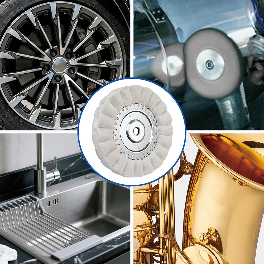 عجلة تلميع مجرى الهواء الدقيقة على شكل حرف S مقاس 8 بوصات مع محور أربور خالٍ من الشفة مقاس 5/8 بوصة، وعجلات تلميع لمطحنة الزوايا، وعجلات تلميع لإنهاء المرآة على إطارات عجلات الشاحنات المصنوعة من الفولاذ المقاوم للصدأ المصنوعة من الألومنيوم