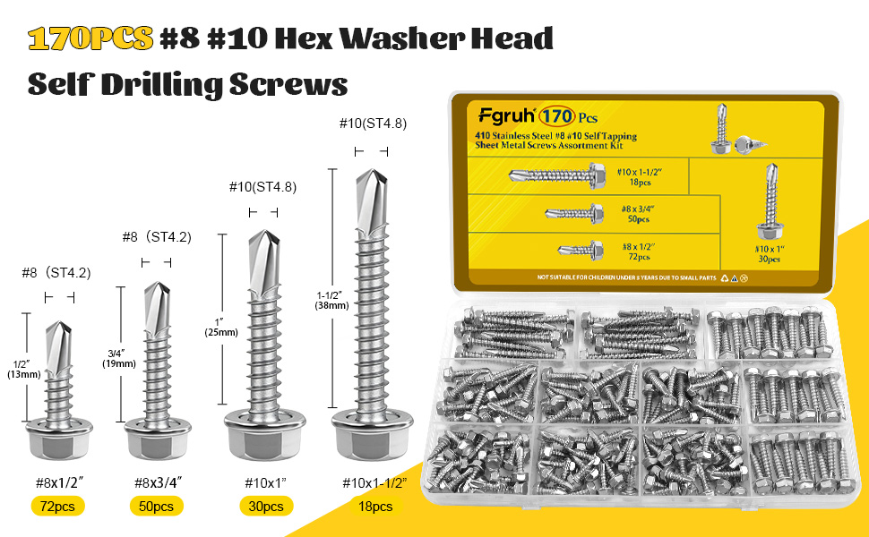 【تفاصيل المنتج】- مجموعة متنوعة من البراغي المعدنية ذاتية اللصق تأتي مع 170 قطعة، وتتضمن 4 مقاسات عملية بوصة: 72 قطعة #8 × 1/2 بوصة، 50 قطعة #8 × 3/4 بوصة، 30 قطعة #10 × 1 بوصة، 18 قطعة #10 × 1-1/2 بوصة. براغي رأس غسالة سداسية فضية، مثالية لأي عمل معدني خفيف أو إصلاحات أو مشروعات DIY عامة.