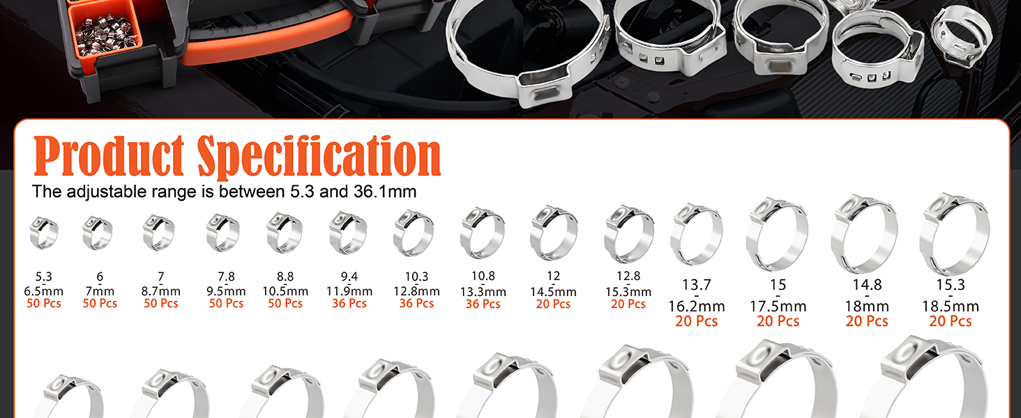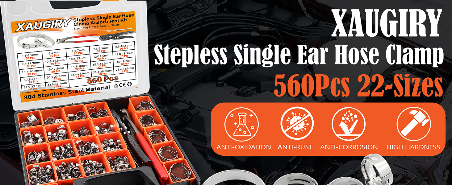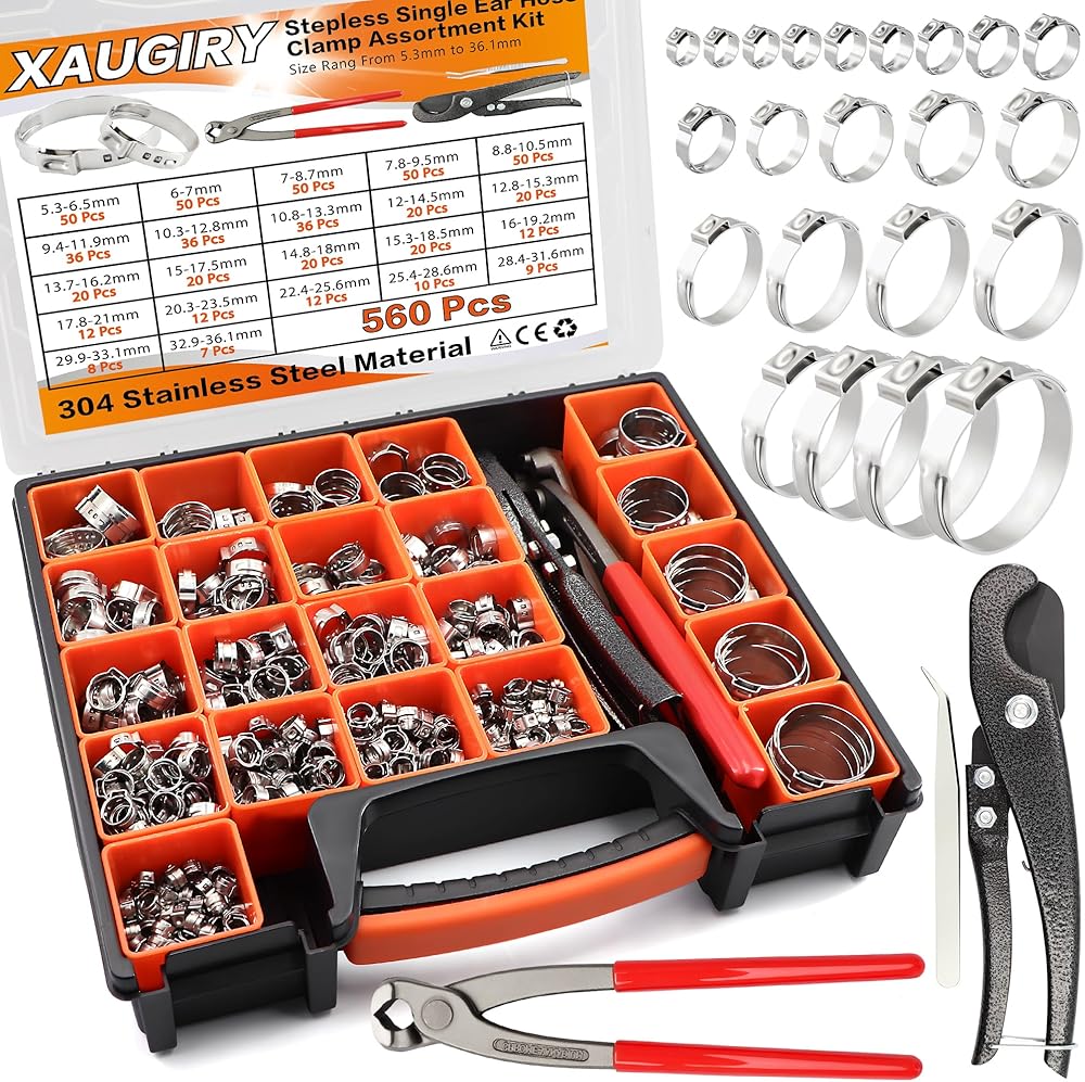 يشتمل على: ما مجموعه 560 قطعة من مشابك خرطوم الأذن المفردة من 22 مقاسًا. يتراوح الحجم من 5.3 مم إلى 36.1 مم. الصندوق البلاستيكي المقسم بوضوح يجعل من السهل التمييز بين مشابك الخرطوم بأحجام مختلفة، وهو مجهز بكماشة مشبك الأذن وملقط وسكين قطع الأنابيب لسهولة الاستخدام.