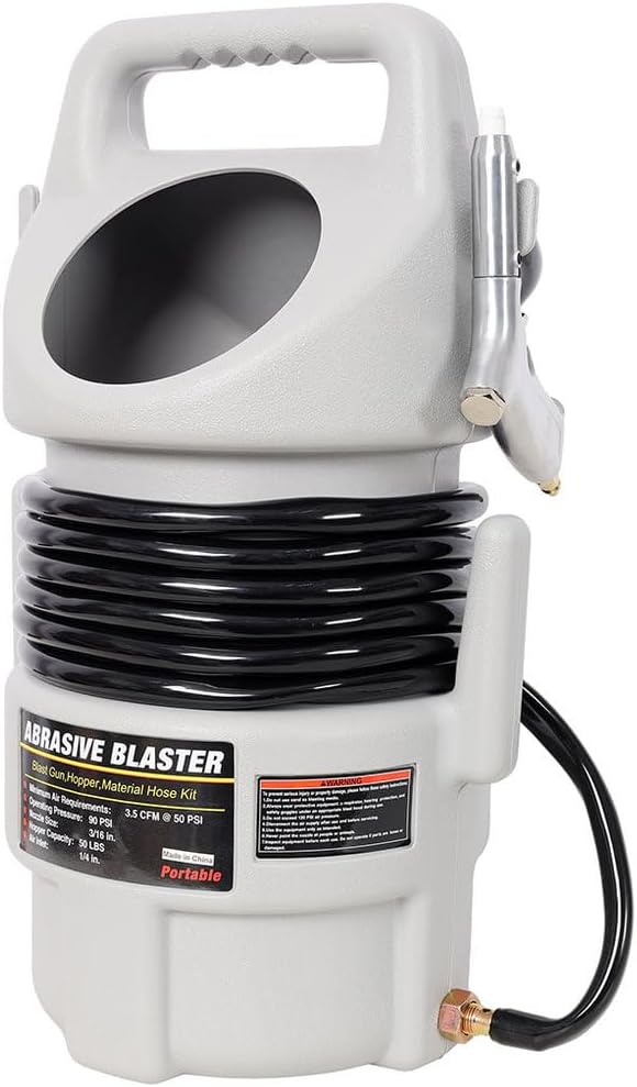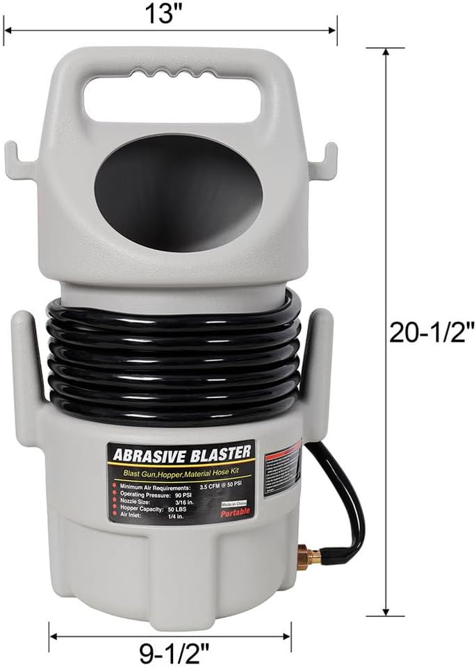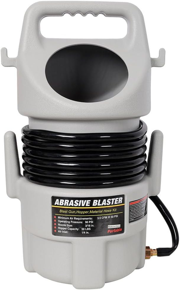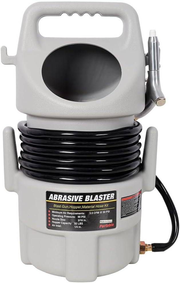 • Complete Blasting Kit: Includes a large capacity hopper, durable aluminum blast gun, and a 15-foot material hose for flexible and efficient operation.