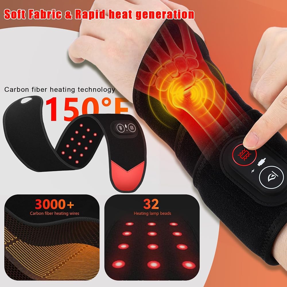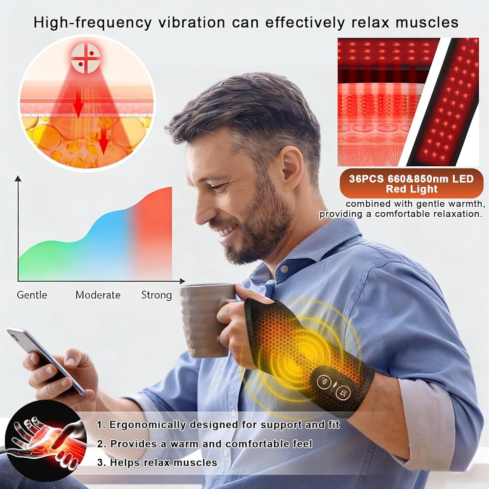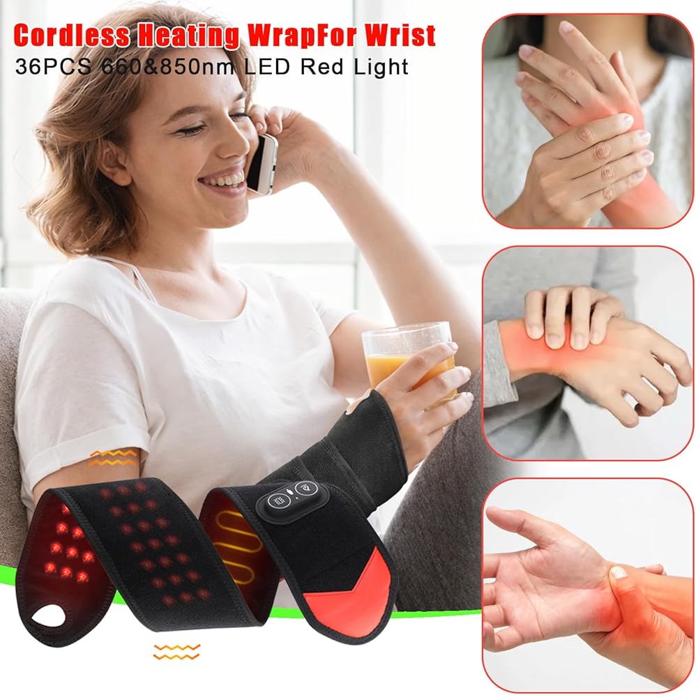 العلاج بالضوء الأحمر للمعصم، جهاز دعم نفق الرسغ مع اهتزاز حراري، مدلك المعصم مع 36 مصباح LED 660 نانومتر/850 نانومتر، لفافة وسادة تسخين لاسلكية، 3000 مللي أمبير قابلة لإعادة الشحن لراحة اليد والاسترخاء اليومي