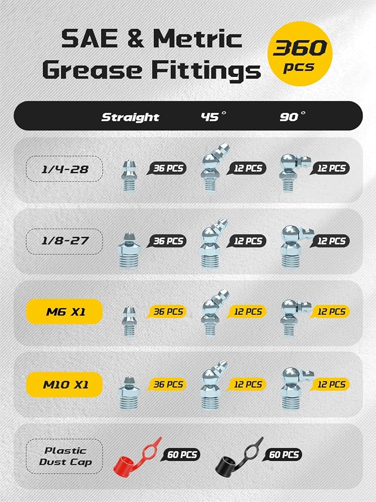الأحجام القياسية SAE والمترية: تحتوي مجموعة أطراف مسدس الشحوم على 1/4 بوصة، 1/8 بوصة، M6 وM10 مناسبة للشحوم بدرجات مستقيمة و45 درجة و90 درجة، هذه التركيبات المستقيمة والزاوية لمسدس الشحوم تلبي احتياجاتك من التطبيقات المختلفة.