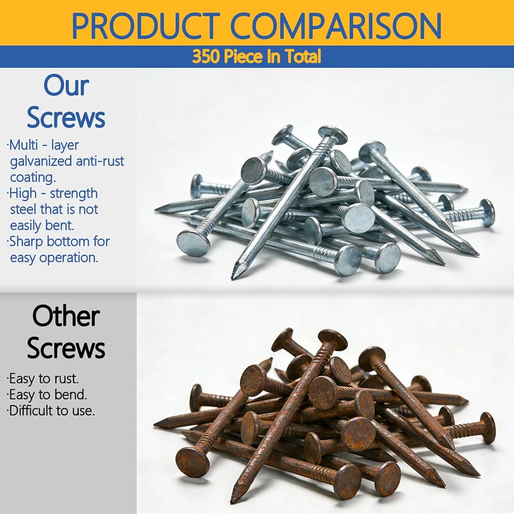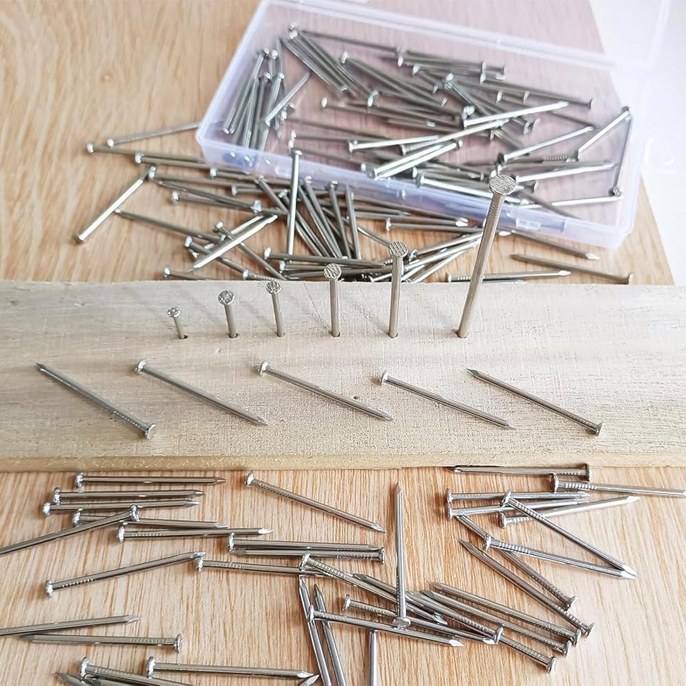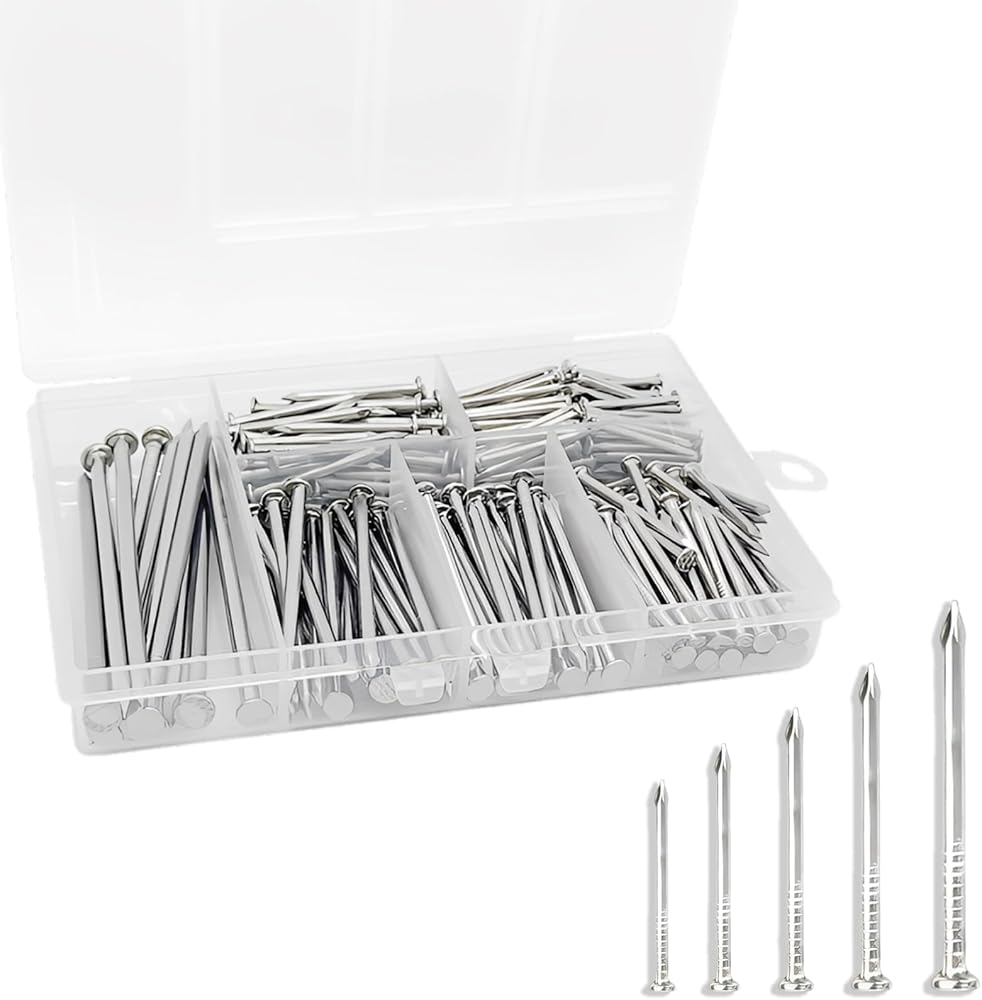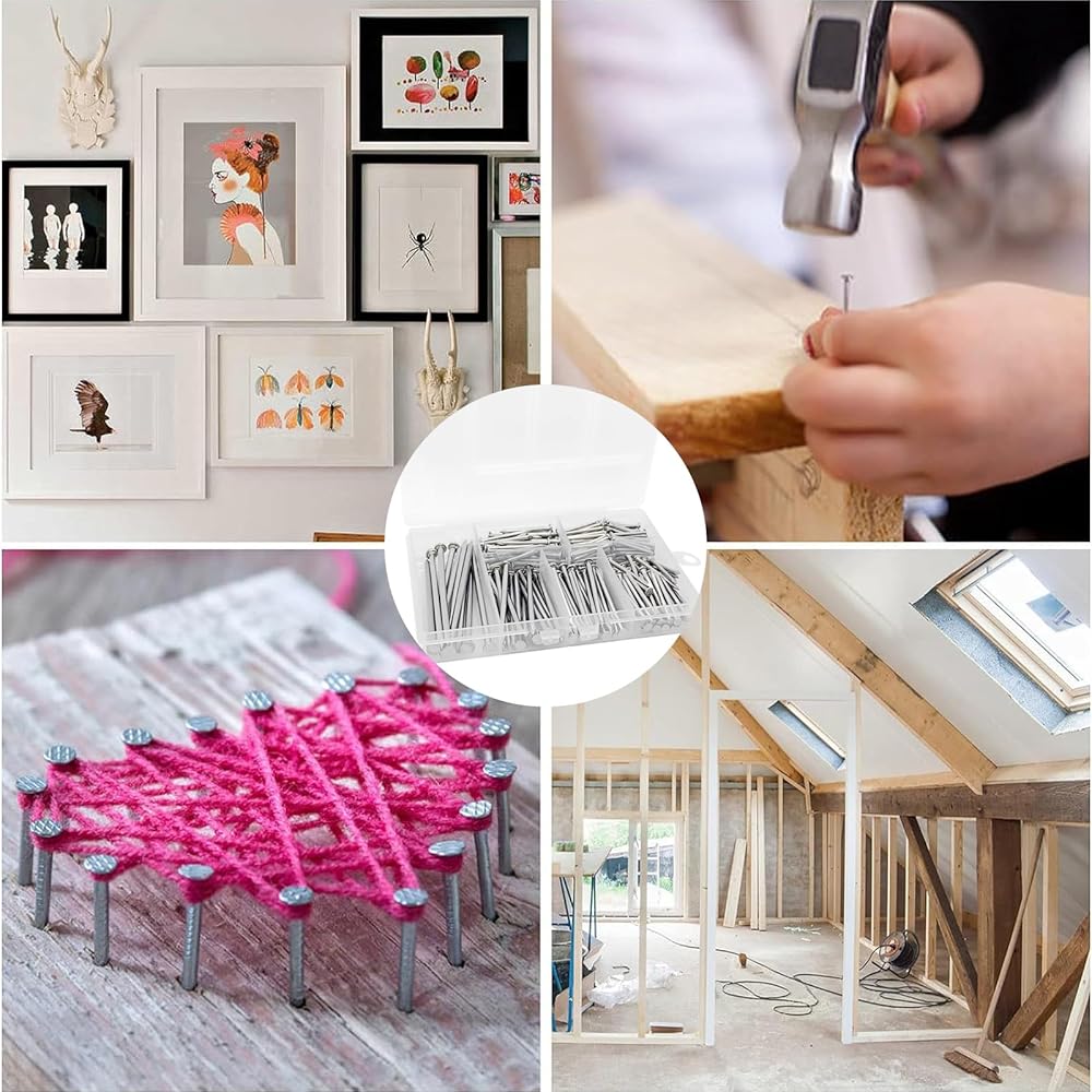 Hzyxgs Nails for Hanging Pictures kit includes 350 premium steel finishing nails 5 sizes 20mm-50mm. Galvanized finish rust resistance. Perfect picture hanging nails dry wall nails for wood framing nails. Clear storage box keeps assorted nails organized. Essential wall hanging kit every home.