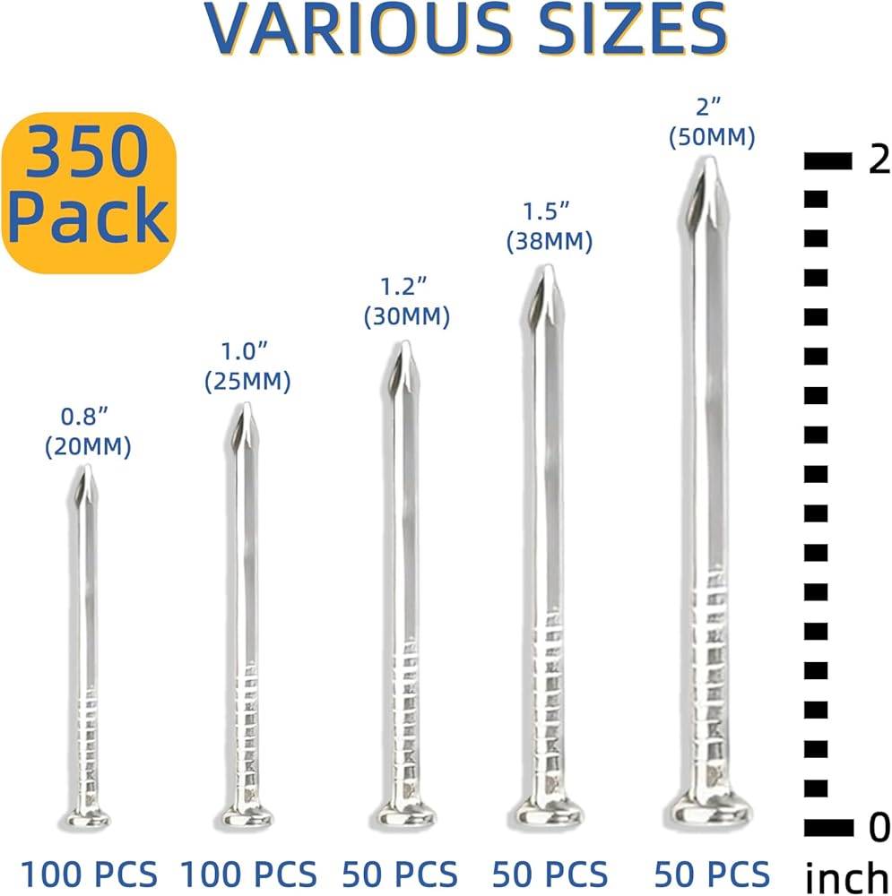 【5 Practical Sizes】Includes 20mm 25mm 30mm 38mm 50mm 350pcs total, versatile small nails for wood trim nails every job, small nails for picture hanging