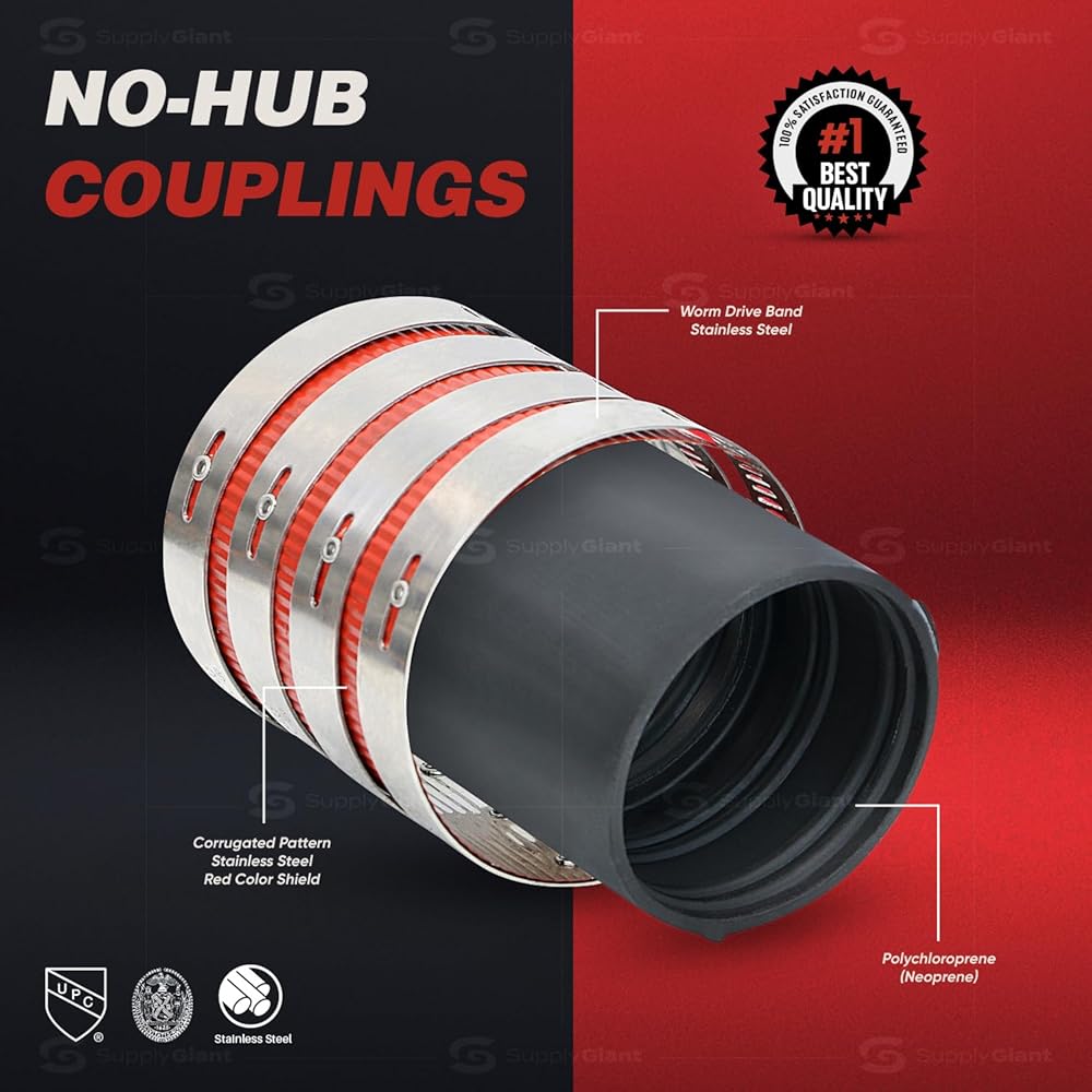 Heavy-Duty Stainless Steel Build – Designed for strength and durability, this coupling securely joins no-hub cast iron soil pipes and fittings in drain, waste, and vent systems.