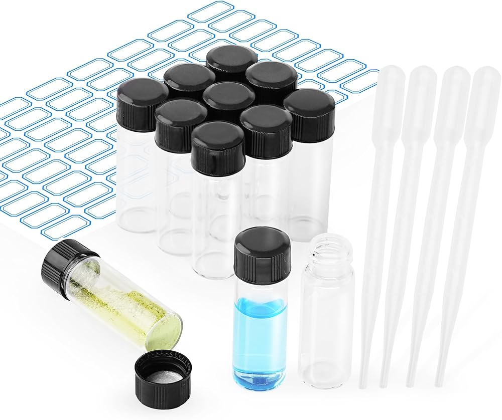 Package - 4ml*10pcs glass vials,10pcs screw PP caps with PE pads, 4 droppers for easy dispensing of liquids and labels for better labeling