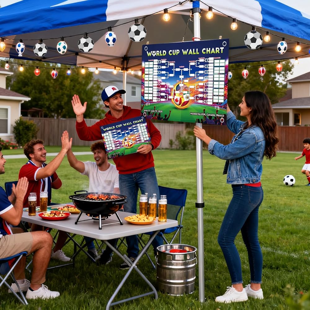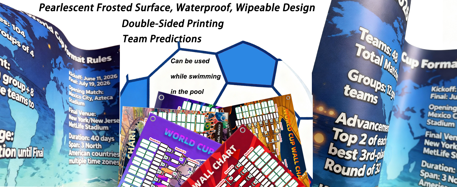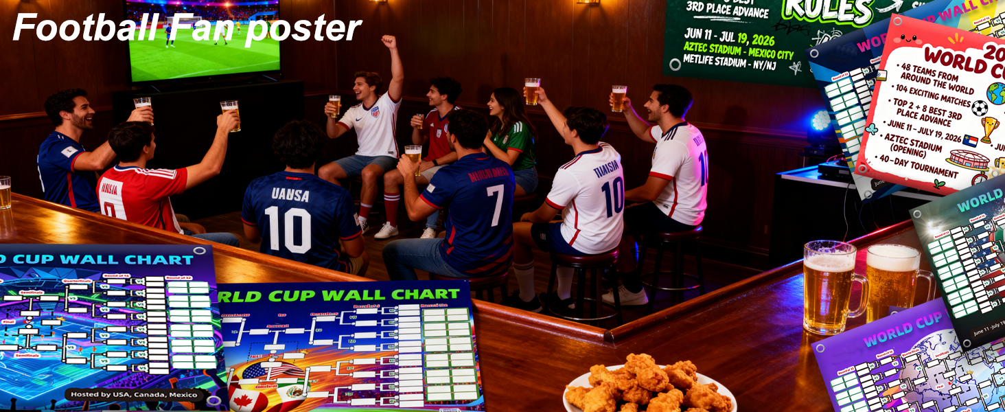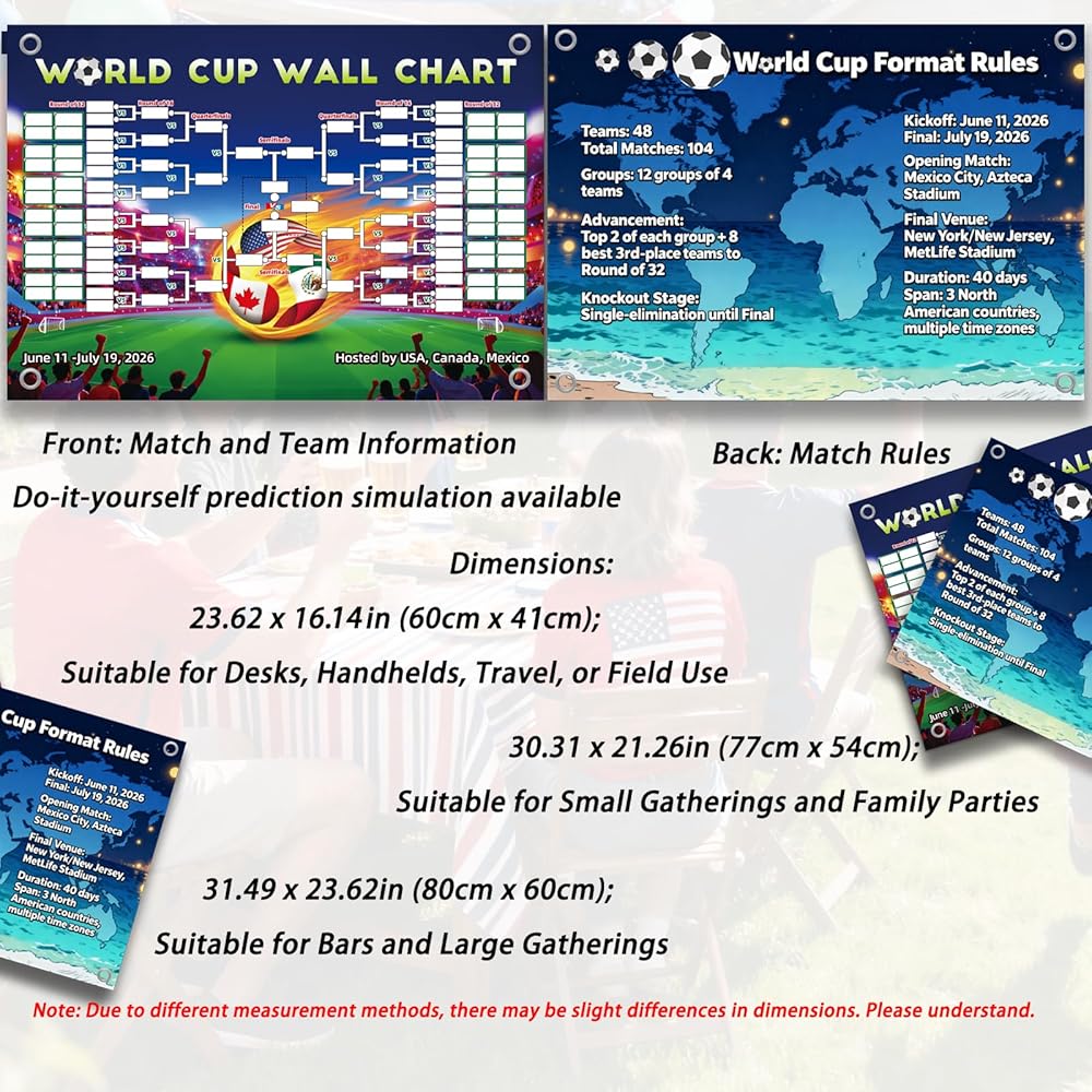 • ملصق جدول كأس العالم 2026: ملصق وظيفي اثنين في واحد؛ يسمح أحد الجانبين بمحاكاة تتبع المباريات، بينما يعرض الجانب الآخر القواعد والجداول الزمنية.