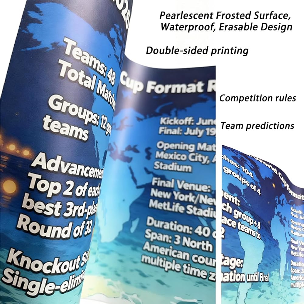 ملصق جدول كأس العالم، بضائع كأس العالم، طباعة مزدوجة الجوانب، بدون تجعد، جدول زمني مقاوم للماء، قابل للمسح، جدول بطولة كرة القدم 2026 ومخطط معلومات الفريق، ملصق هدايا لمحبي كرة القدم