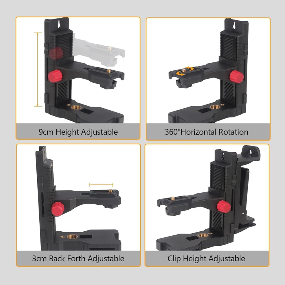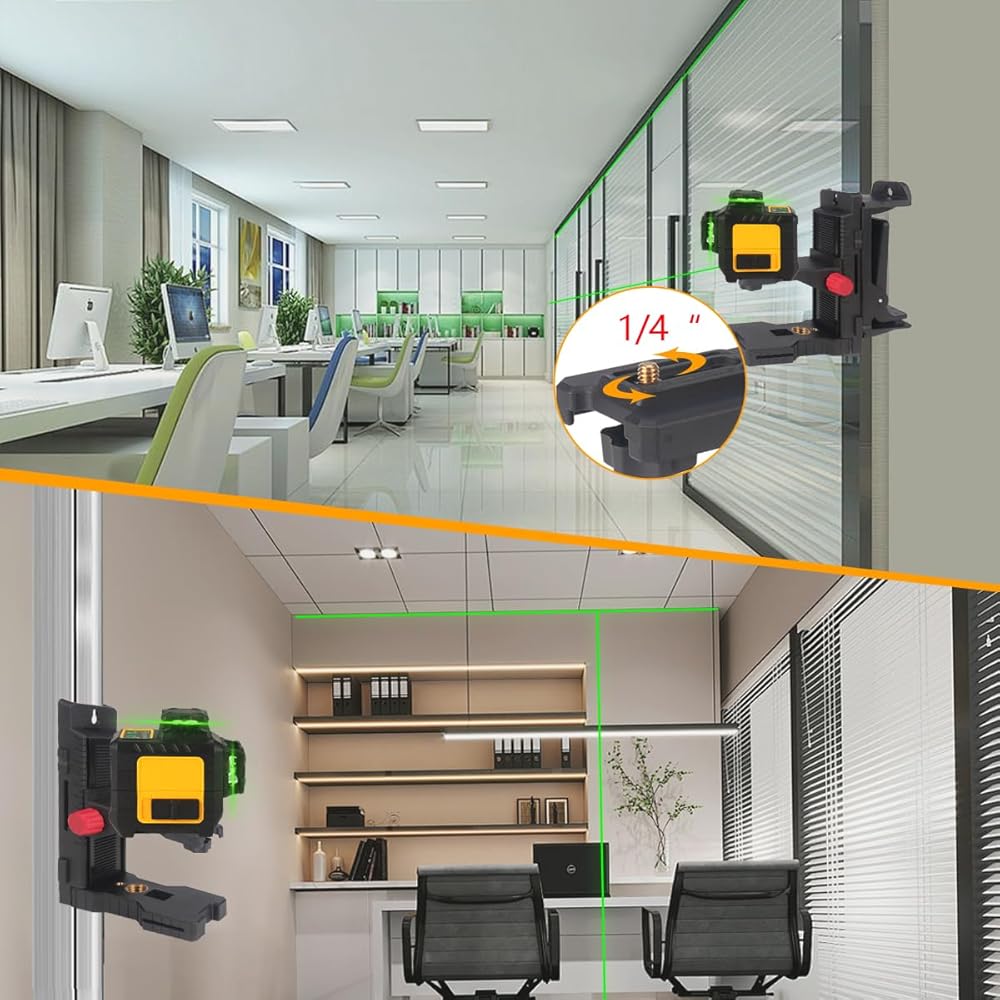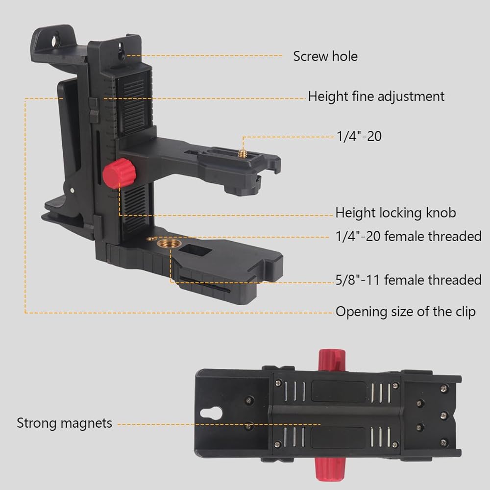 【Multiple Installation Methods】1/4"-20 and 5/8"-11 female threads can be connected to a tripod or laser rod. Magnetic back clip: Attach to the metal surface with a Magnetic back clip. Screw holes: hooks, nails, etc. can be used to fix them on the wall. Threading groove: You can use ropes, cable ties and other objects to bind and fix with other objects through this groove.