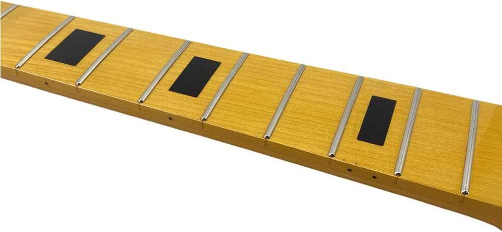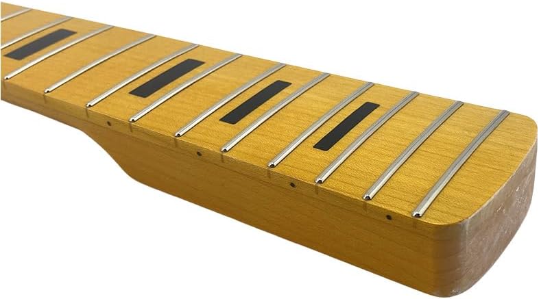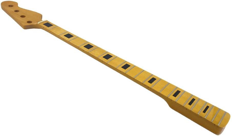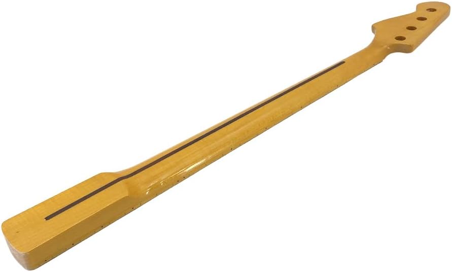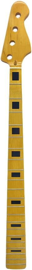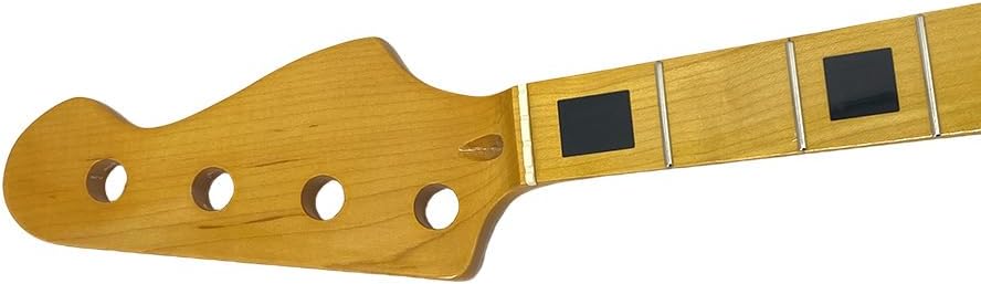 This premium bass guitar neck is crafted from high-quality maple wood, offering exceptional resonance and durability for your instrument. Featuring a striking yellow finish that adds visual appeal to any bass guitar build or replacement project, this neck comes equipped with 21 frets along a standard 34-inch scale length. The fingerboard showcases elegant block inlays that provide both aesthetic charm and practical position markers for precise playing. With a nut width of 38mm and heel width of 64mm, this neck offers comfortable playability suitable for various playing styles. The four mounting holes on the headstock allow for easy tuner installation, while the pre-cut truss rod slot ensures proper neck relief adjustment. Whether you're building a custom bass from scratch, upgrading your current instrument, or replacing a damaged neck, this maple construction delivers the tonal clarity and sustain that bass players demand. The smooth finish and professional fretwork make this neck ready for installation and play.