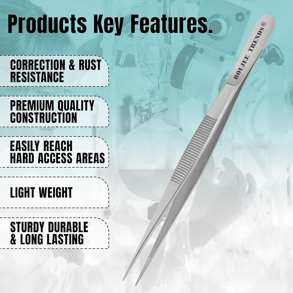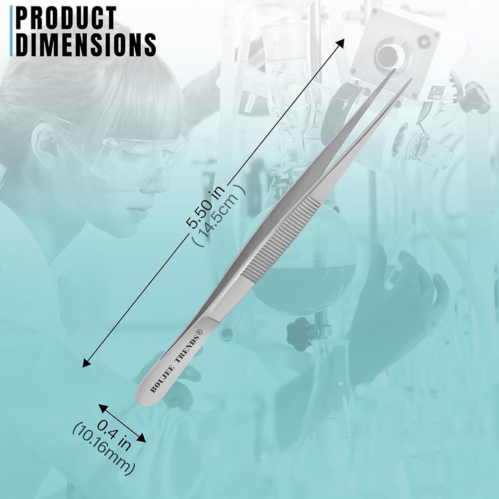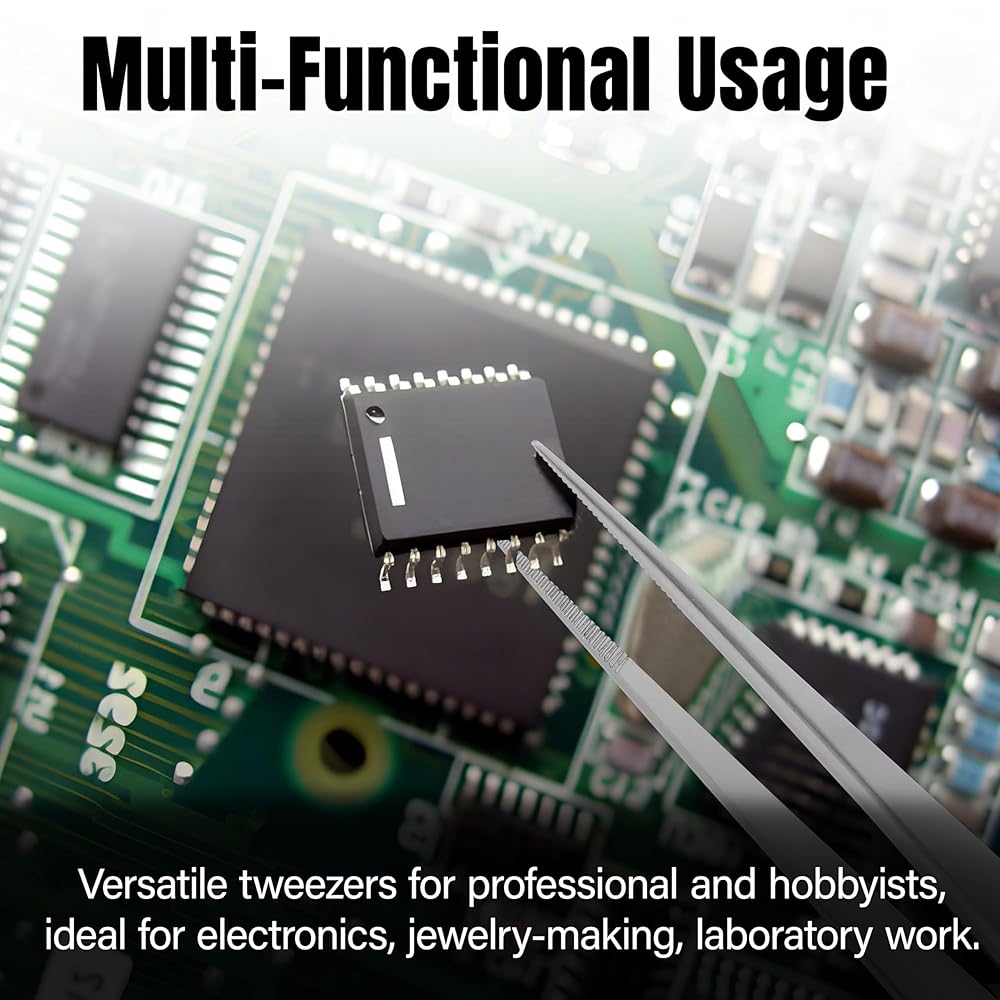 ENGINEERED FOR ULTIMATE PRECISION: Crafted from high-grade, anti-corrosive stainless steel with a fine, straight serrated point for exceptional control. The meticulously aligned tips ensure a strong, secure grip on the smallest components, from delicate SMD chips to fine splinters. LABORATORY-GRADE DURABILITY & HYGIENE: Built to withstand rigorous daily use in demanding environments. Fully autoclavable and easy to sterilize with alcohol, making them a safe and reliable choice for scientific labs, medical applications, and sterile workshops. ERGONOMIC & FATIGUE-FREE DESIGN: Features a polished, non-glare finish and a calibrated tension spring for smooth, easy manipulation. The lightweight design and balanced grip allow for hours of comfortable use without hand strain, essential for intricate art and craft projects. UNIVERSAL MULTI-PURPOSE APPLICATION: An indispensable tool for a vast range of tasks beyond the lab, including jewelry making and repair, detailed model building, electrical engineering, and even precise culinary plating. Its versatility makes it a must-have for professionals and hobbyists alike. GUARANTEED RELIABILITY & PERFORMANCE: Each pair is individually inspected and tested to meet strict performance standards. We stand behind the quality of our instruments, ensuring you receive a durable, high-precision tool that delivers consistent results project after project.