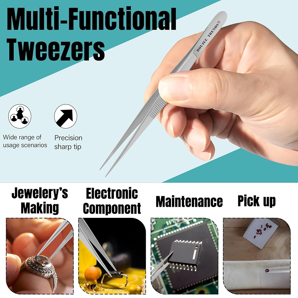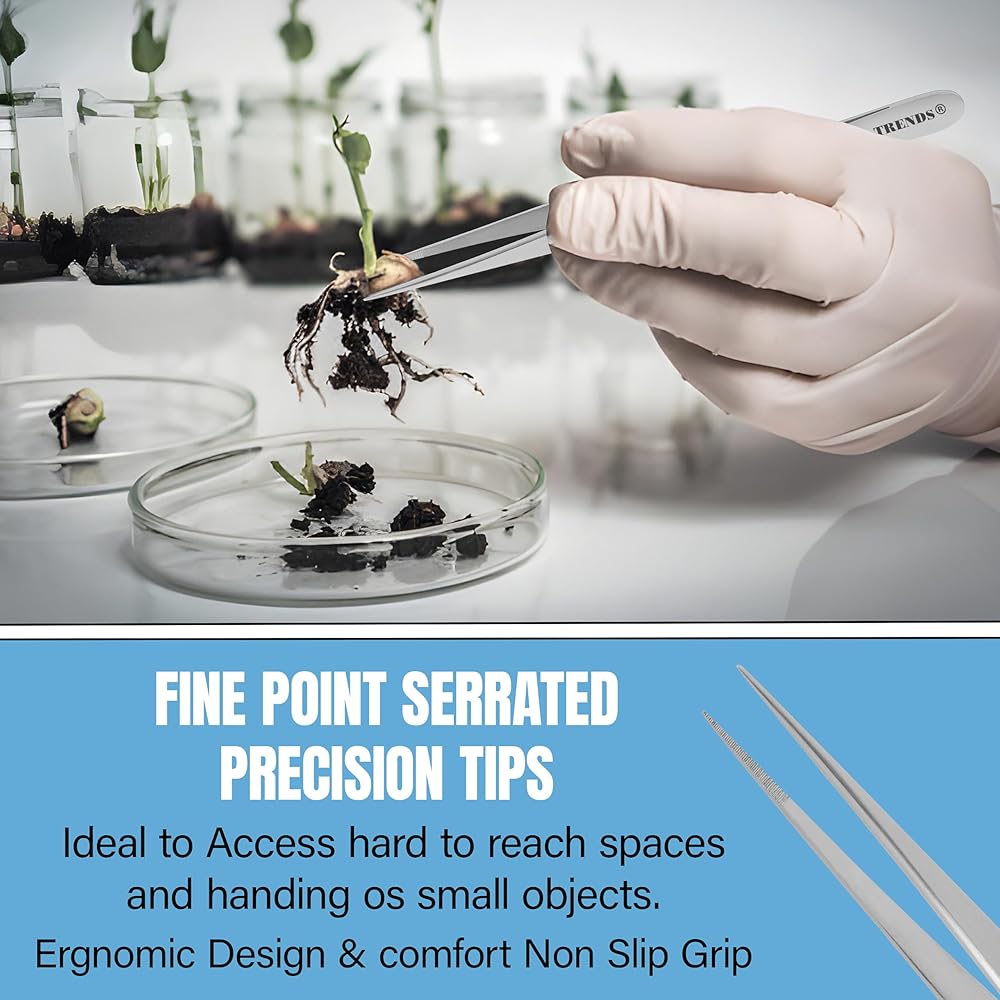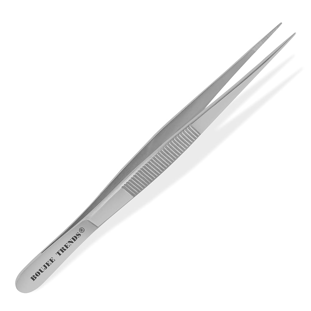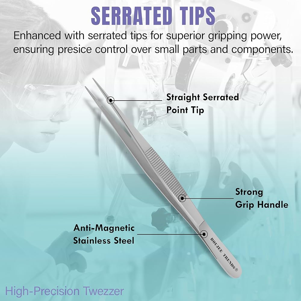ENGINEERED FOR ULTIMATE PRECISION: Crafted from high-grade, anti-corrosive stainless steel with a fine, straight serrated point for exceptional control. The meticulously aligned tips ensure a strong, secure grip on the smallest components, from delicate SMD chips to fine splinters. LABORATORY-GRADE DURABILITY & HYGIENE: Built to withstand rigorous daily use in demanding environments. Fully autoclavable and easy to sterilize with alcohol, making them a safe and reliable choice for scientific labs, medical applications, and sterile workshops. ERGONOMIC & FATIGUE-FREE DESIGN: Features a polished, non-glare finish and a calibrated tension spring for smooth, easy manipulation. The lightweight design and balanced grip allow for hours of comfortable use without hand strain, essential for intricate art and craft projects. UNIVERSAL MULTI-PURPOSE APPLICATION: An indispensable tool for a vast range of tasks beyond the lab, including jewelry making and repair, detailed model building, electrical engineering, and even precise culinary plating. Its versatility makes it a must-have for professionals and hobbyists alike. GUARANTEED RELIABILITY & PERFORMANCE: Each pair is individually inspected and tested to meet strict performance standards. We stand behind the quality of our instruments, ensuring you receive a durable, high-precision tool that delivers consistent results project after project.