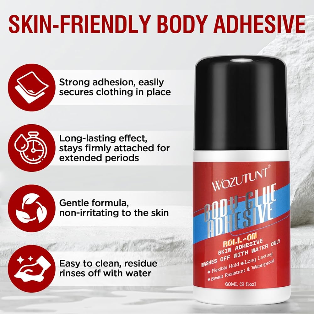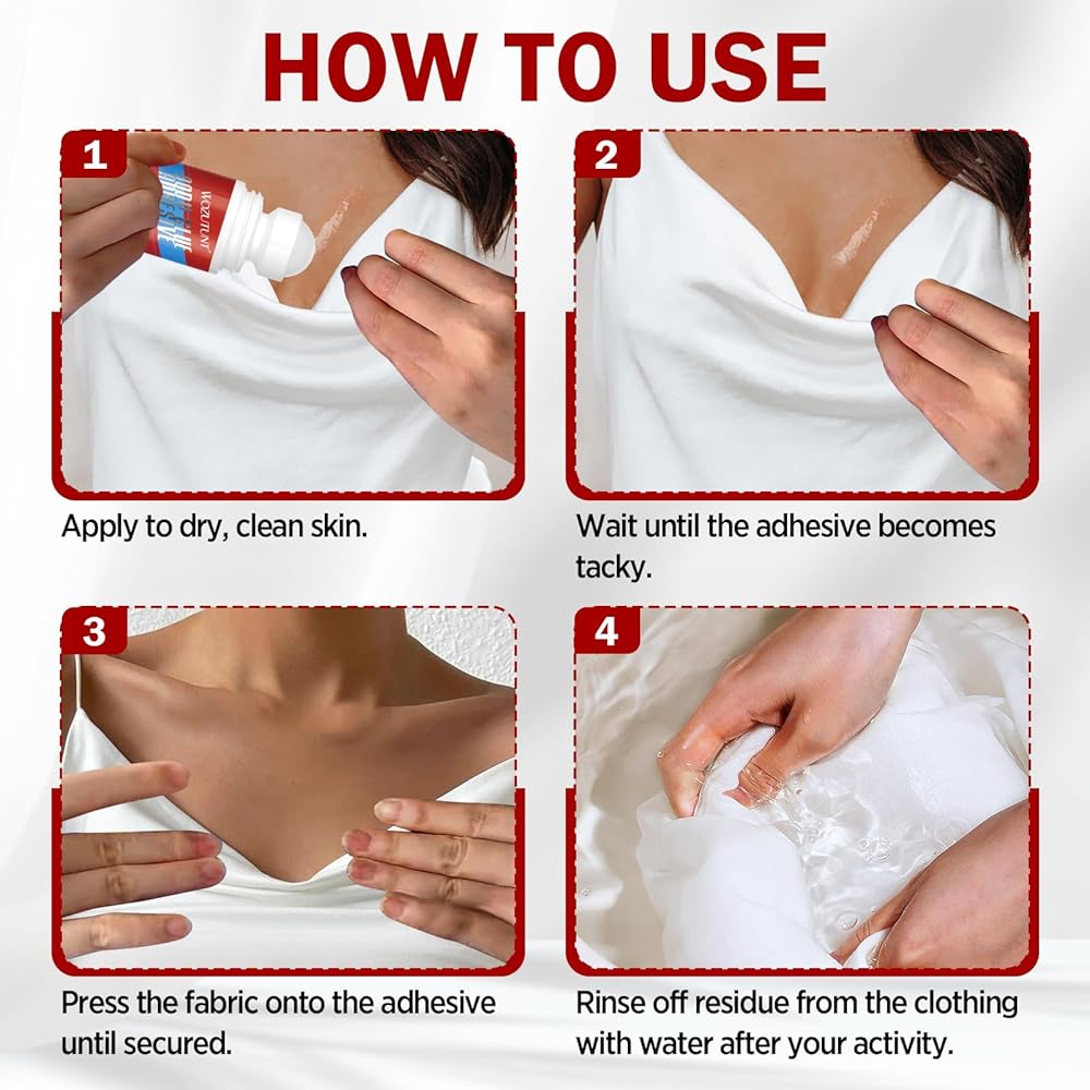 • إزالة لطيفة وسهلة: يتم شطف لاصق الجسم هذا بالماء، دون ترك أي بقايا على الجلد أو الأقمشة. آمن للاستخدام المتكرر على المواد الحساسة مثل الدانتيل والجوارب