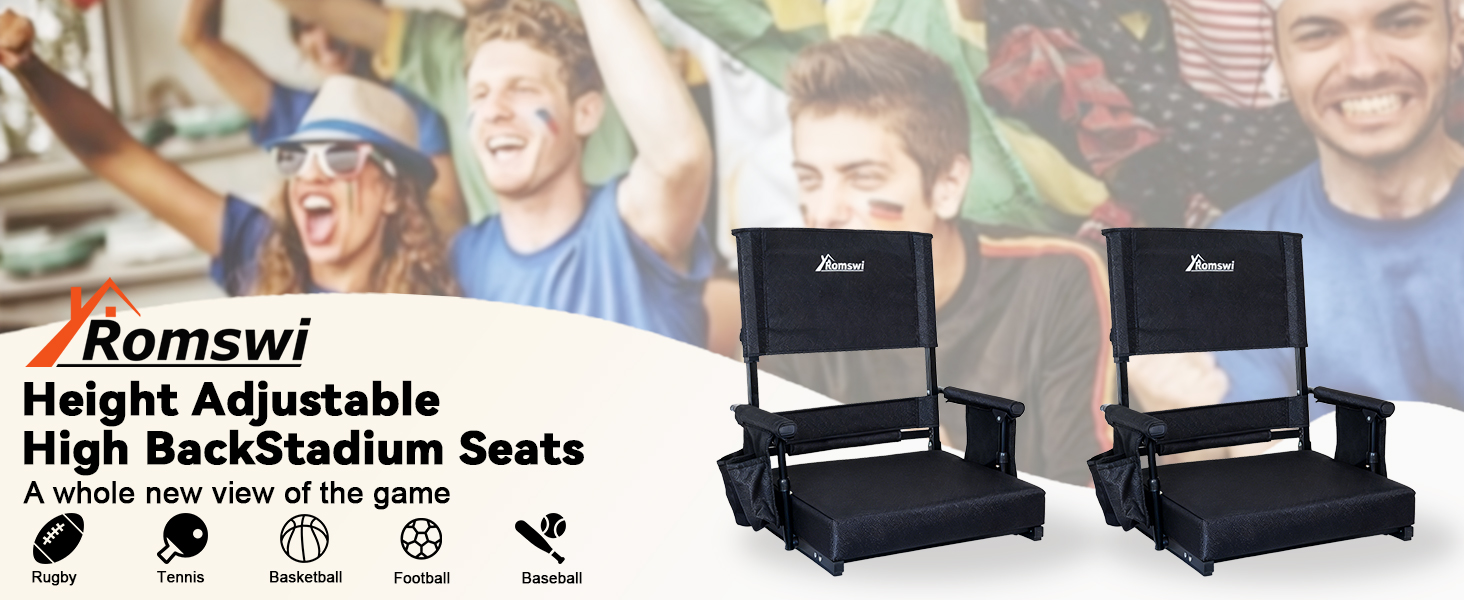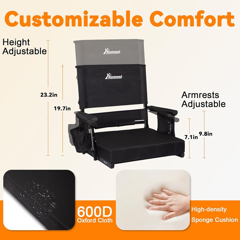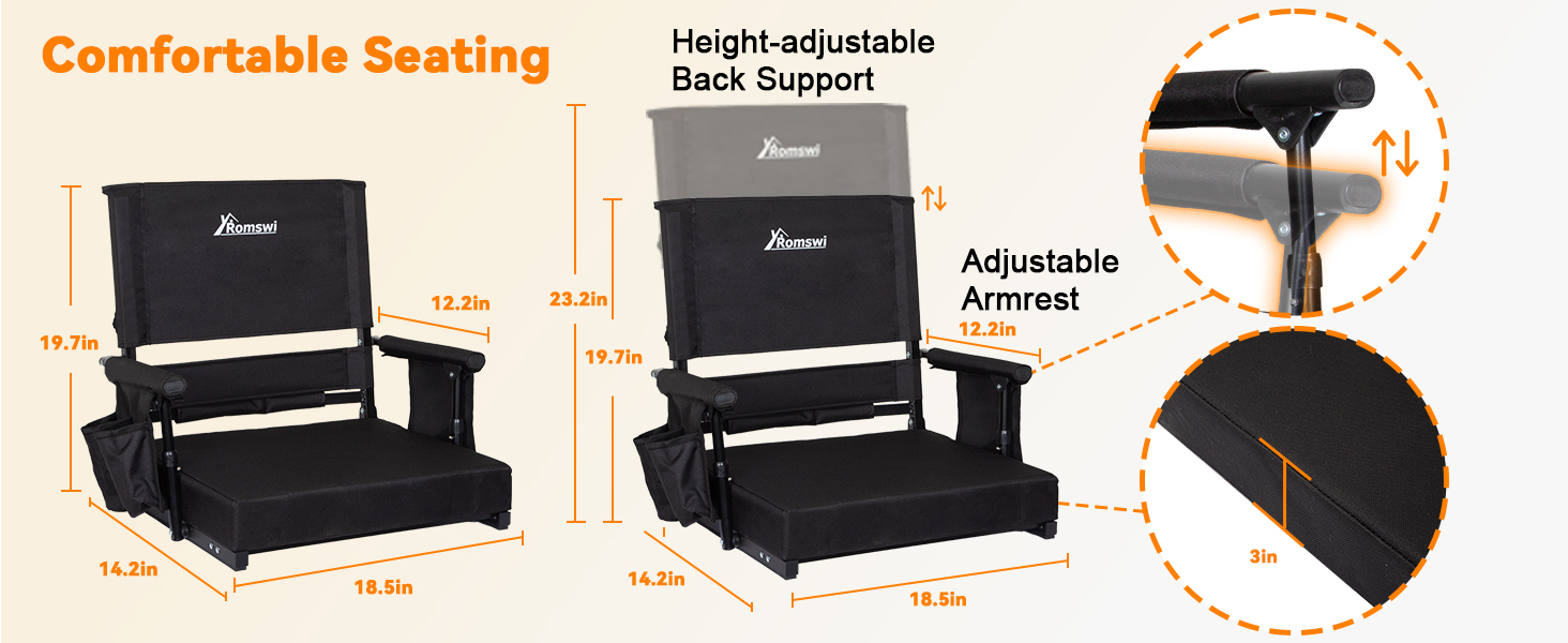 راحة ودعم قابلان للتخصيص: اضبط مقعدك على الوضع المثالي. يتميز مقعد استاد رومسوي بظهر مرتفع بموضعين (20.1 بوصة أو 23.6 بوصة) ومساند للذراعين بمستويين (6.7 بوصة أو 9.4 بوصة). توفر مقاعد الاستاد القابلة للتعديل بالكامل مع مساند للذراعين دعمًا شخصيًا ومريحًا لأي مستخدم.