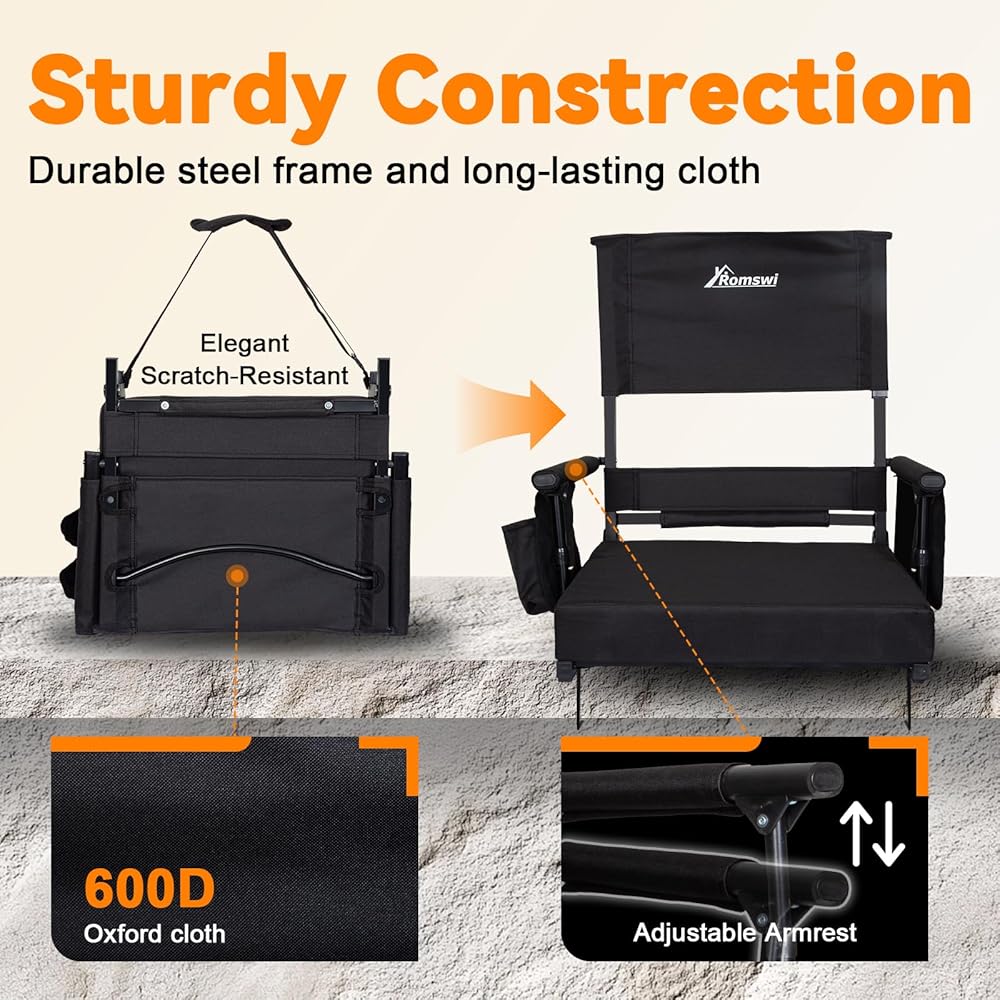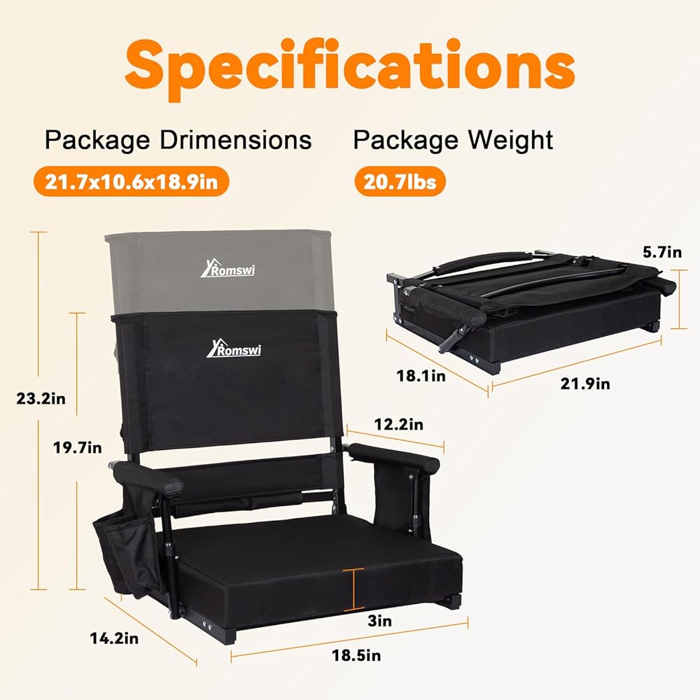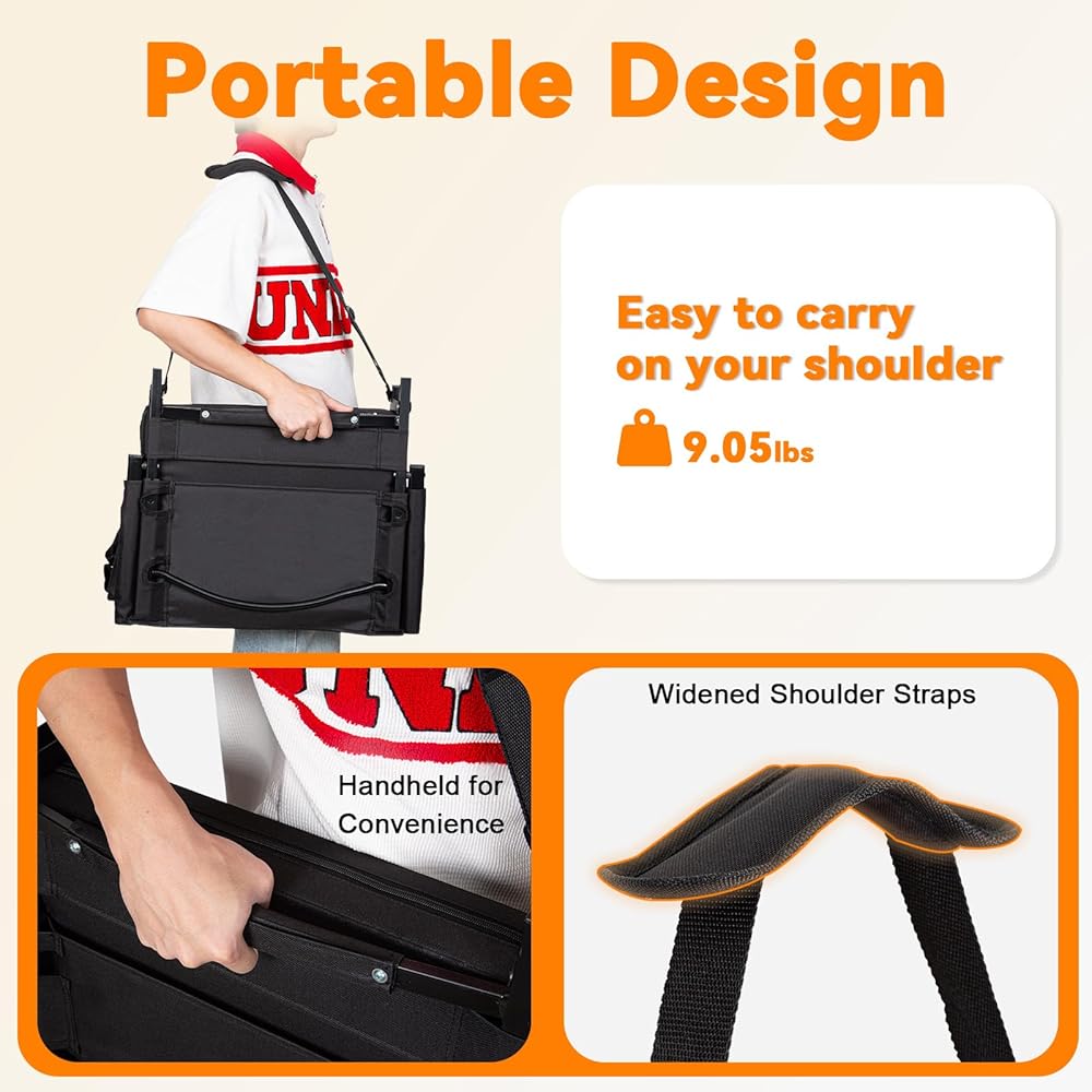 خفيف الوزن وسهل النقل: يزن هذا المقعد 9.05 رطل فقط، ويمكن طيه بشكل صغير ويتميز بحزام كتف واسع وقابل للتعديل لسهولة الحمل. مثالي للملاعب والحفلات الموسيقية والتخييم والمزيد - مقعدك المحمول الذي يمكنك الذهاب إليه لأي مغامرة.